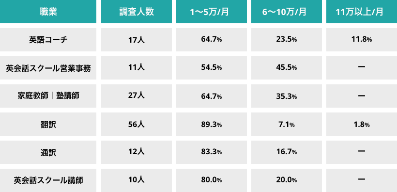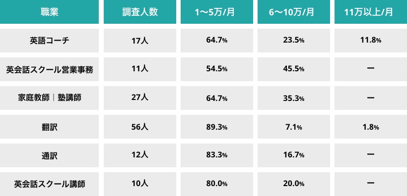 ■月6万円以上の収入が得られている人の割合が多い副業は「1位:英会話スクール営業事務(45.5%)」「2位:英語コーチ(35.3%)」「2位(同率):家庭教師(35.3%)」。また、月11万円以上の収入が得られている人の割合が多い副業は「英語コーチ:11.8%」であることが分かった。