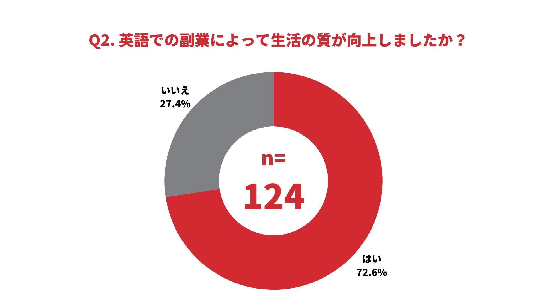 「Q.2 英語での副業によって生活の質が向上しましたか」(n=124)と質問したところ、はいが72.6%、いいえが27.4%という回答になりました。