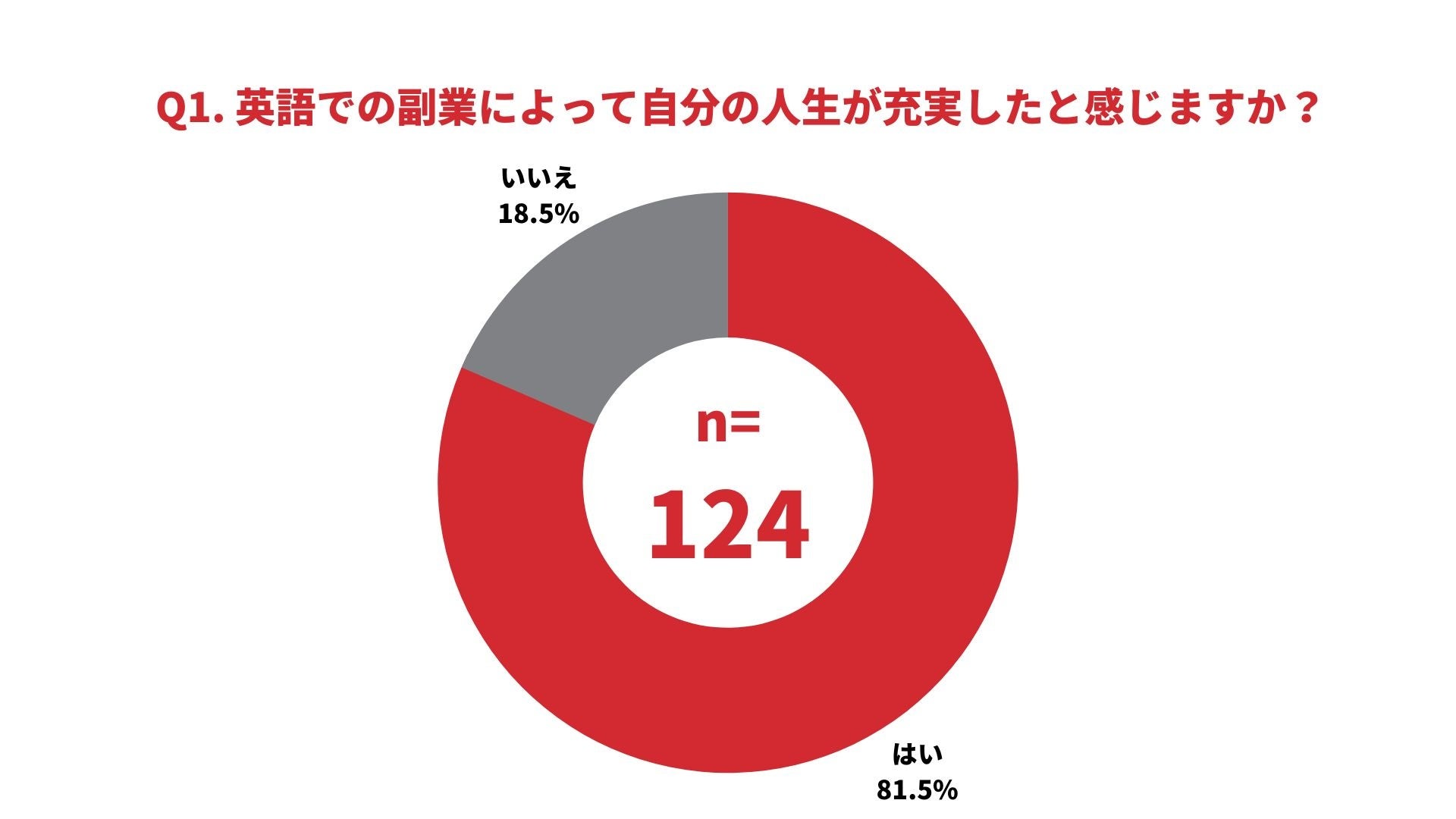 「Q.1 英語での副業によって自分の人生が充実したと感じますか?」(n=124)と質問したところ、はいが81.5%、いいえが18.5%という回答になりました。