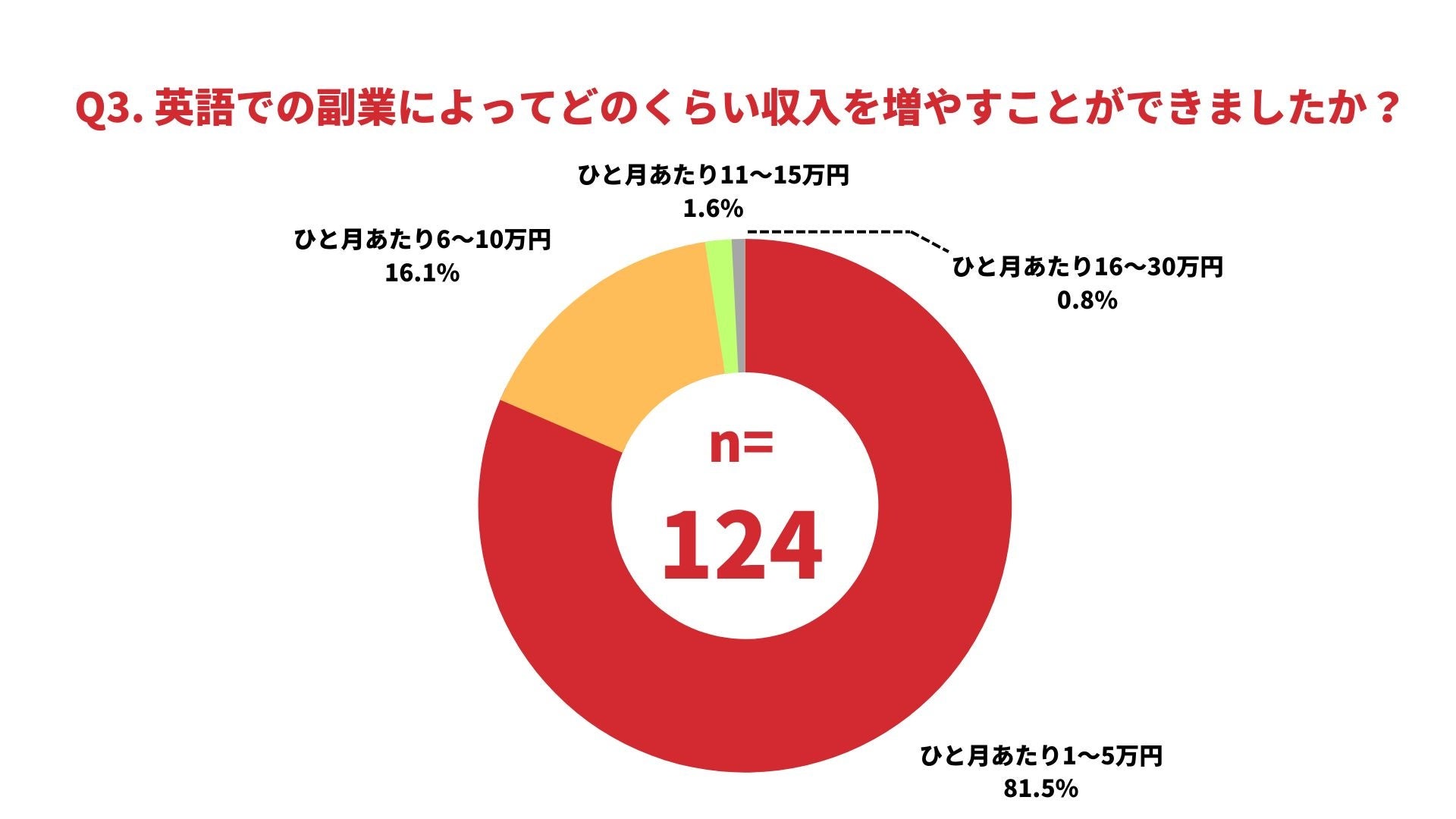 「Q.3 英語での副業によってどのくらい収入を増やすことができましたか?」(n=124)と質問したところ、回答は以下の通りとなりました。