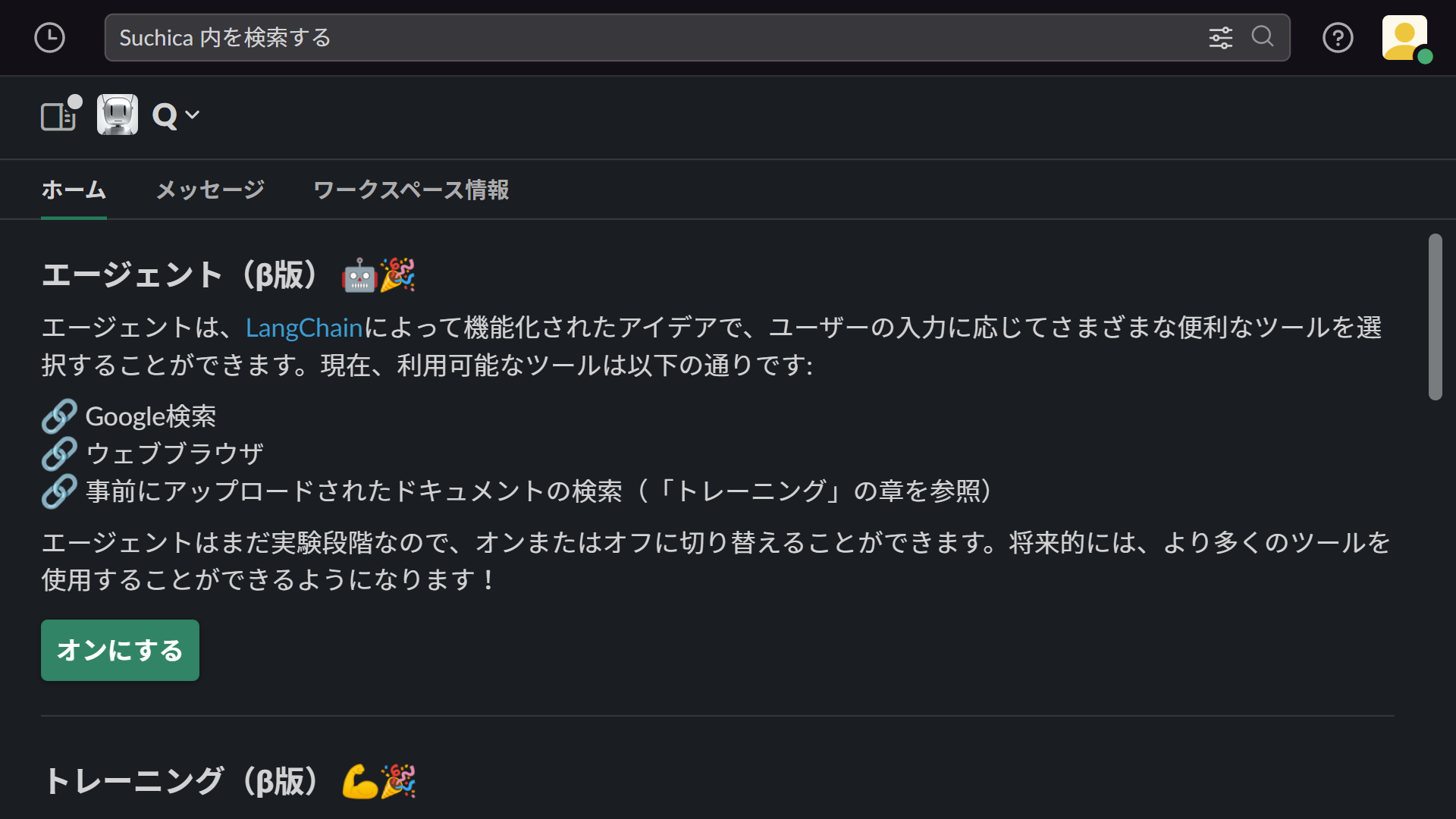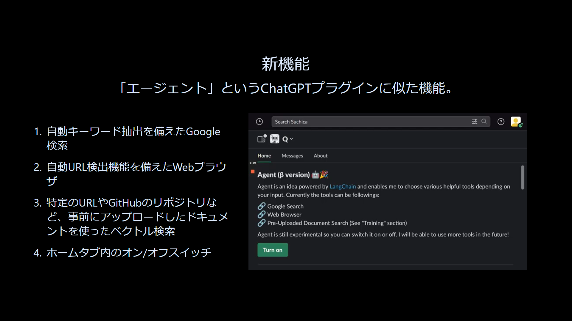 また、SuchicaのSlack版ChatGPT「Q」は、エージェントと呼ぶChatGPTプラグイン機能(β版)もございます。エージェントは、従来のChatGPTの知識の範囲では答えられない場合に、ユーザーのインプットから抽出したキーワードによるGoogle検索、ユーザーのインプットしたURLの閲覧、ユーザーが事前にアップロードしたWEBドキュメントやGitHubリポジトリに対するベクトル検索などをAIの判断で実行します。これらの機能は、ChatGPTの弱点を補うとともに、より一層お客様の生産性を強化します。