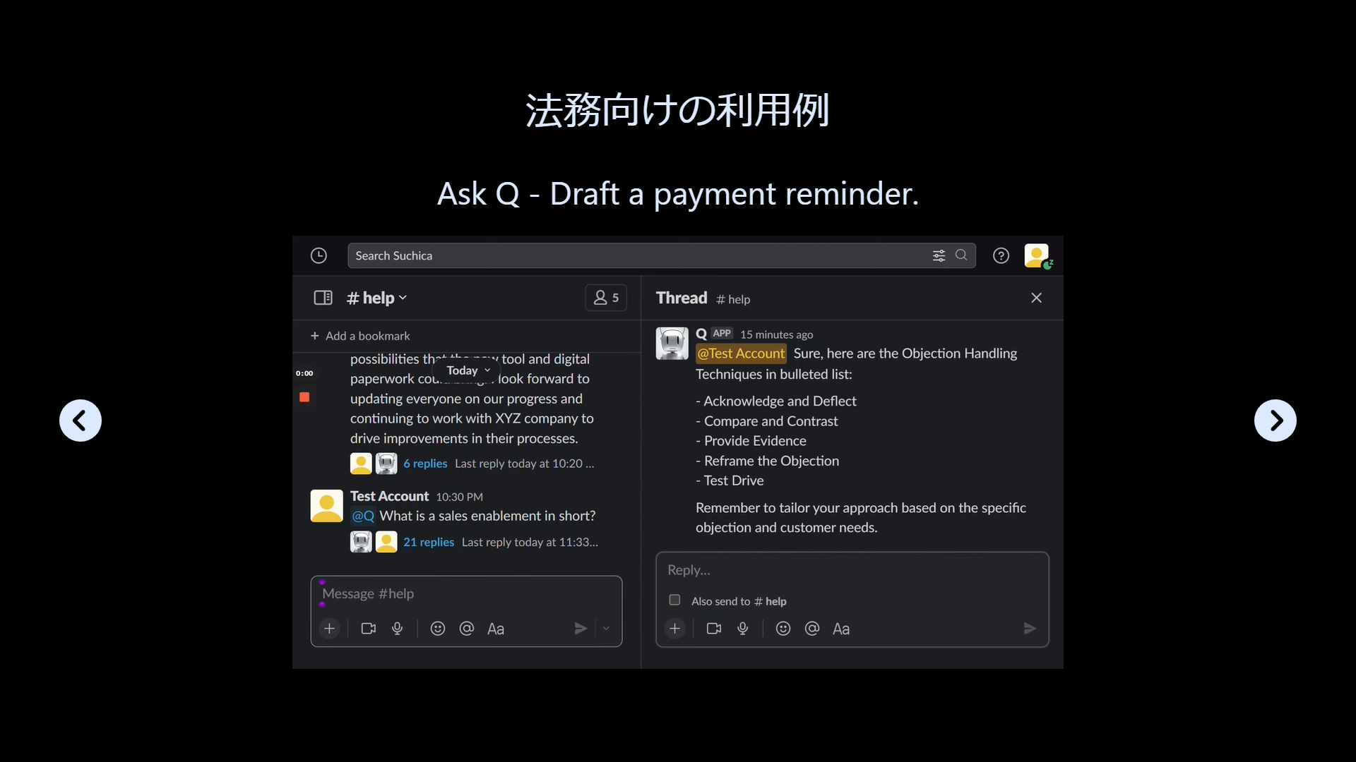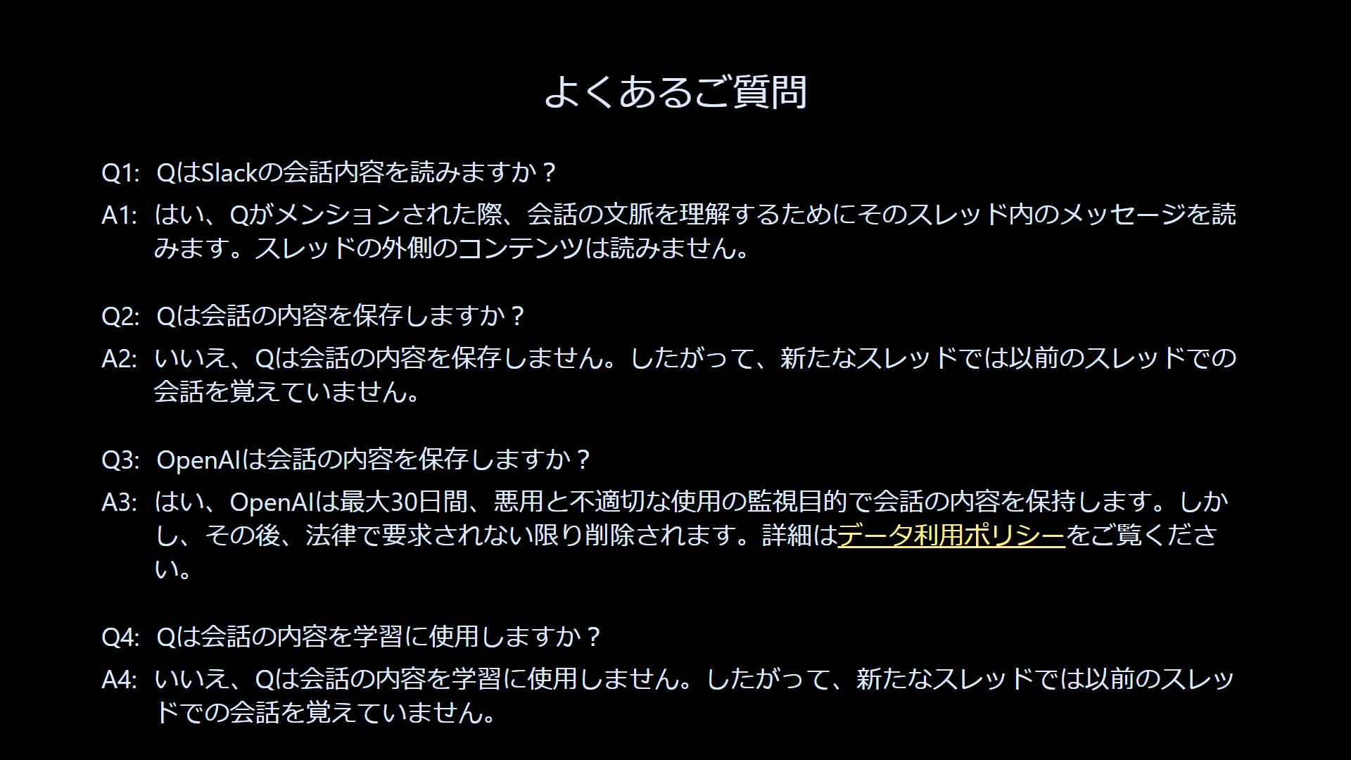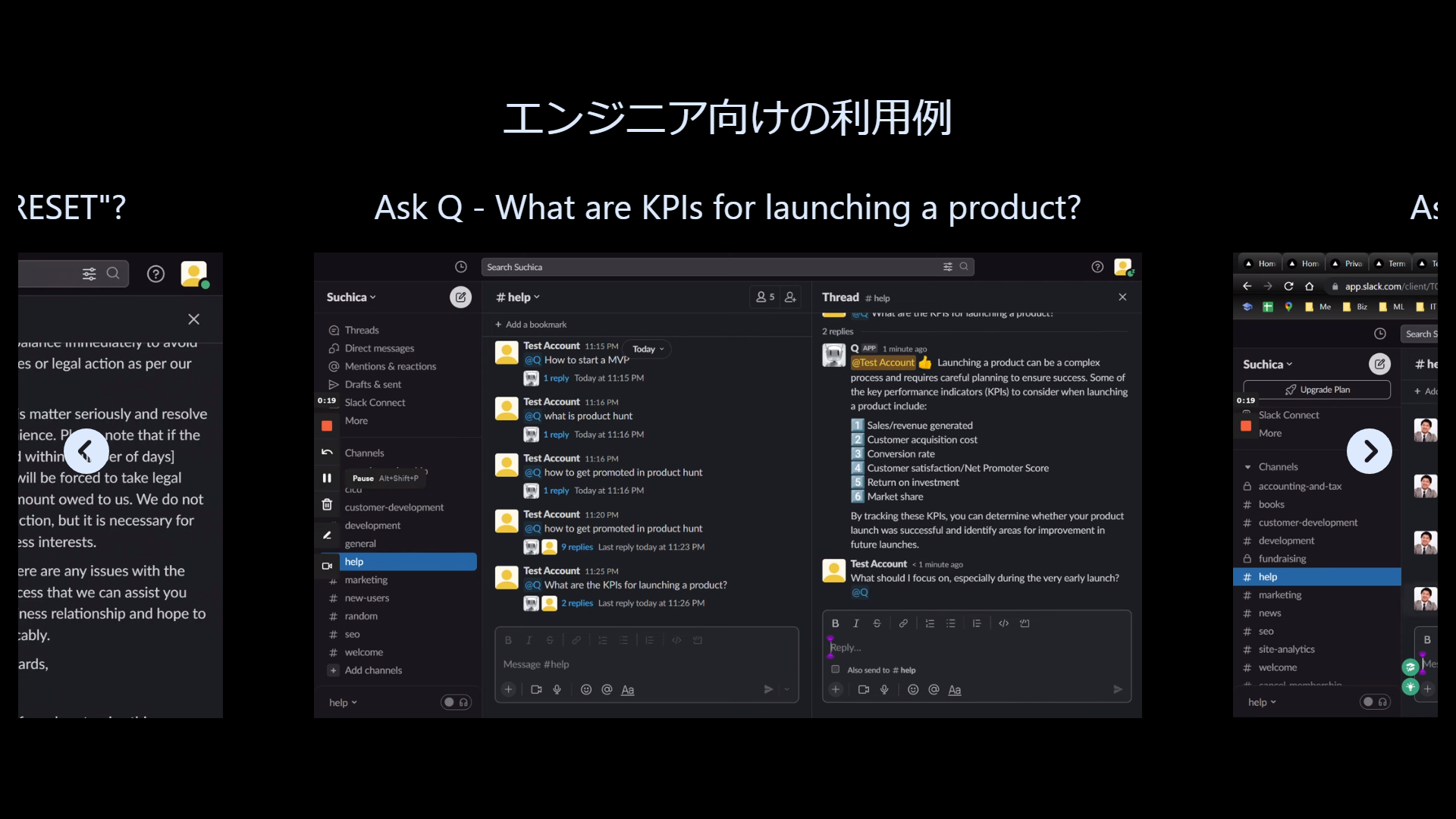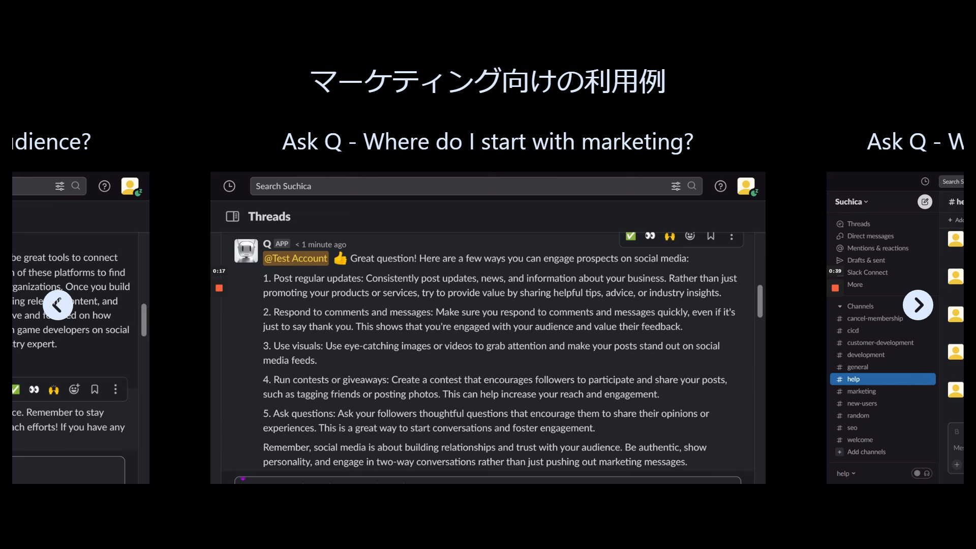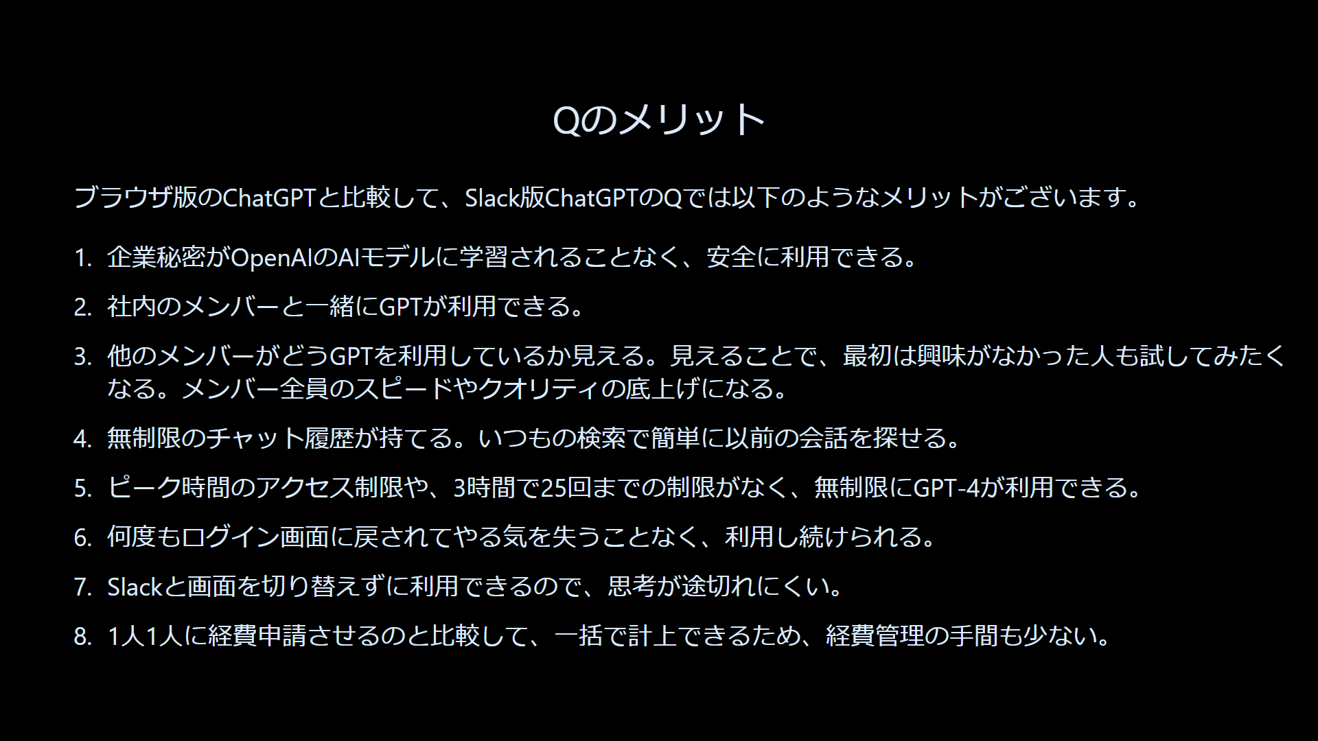 SuchicaがChatGPTをSlackで使えるようにした背景には、組織の生産性向上を目指す強い意志があります。個人個人にAIの利用を促すだけでは不十分で、組織内で具体的なユースケースが簡単に目の届く範囲で共有されてこそ、真の効果が現れると考えています。「Q」はその具体的な実現形として、チームや組織の生産性向上を実現します。