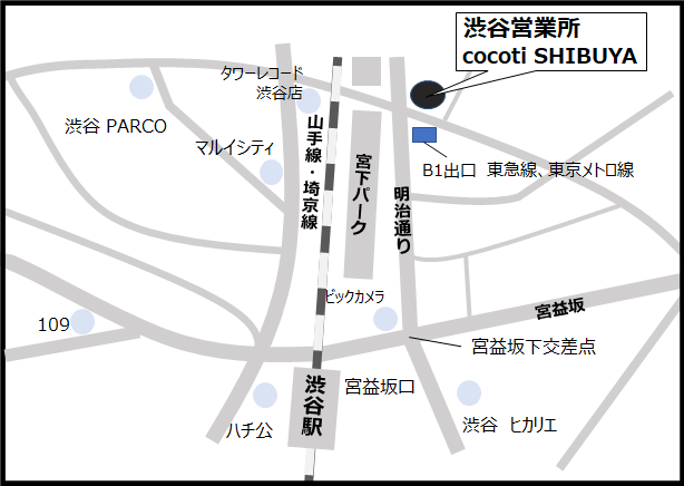 ・交通:東京メトロ半蔵門線、副都心線、東急各線 B1出口 徒歩1分 / JR渋谷駅 宮益坂口 徒歩5分