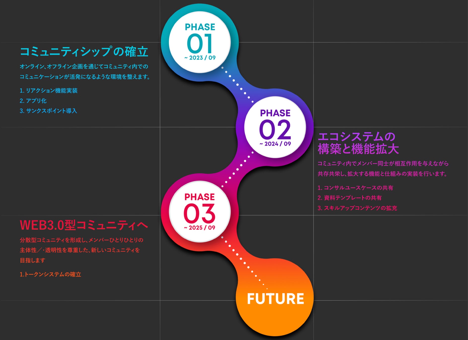 「Chamber」は、今後「コミュニティシップの確立」に続き、スキルアップコンテンツの拡充やコンサルユースケースの共有等を行う「エコシステムの構築と機能拡大」、さらに「Web3.0型コミュニティの確立」に挑戦し、参加者で一緒に創り上げていくコンサルコミュニティを目指しています。