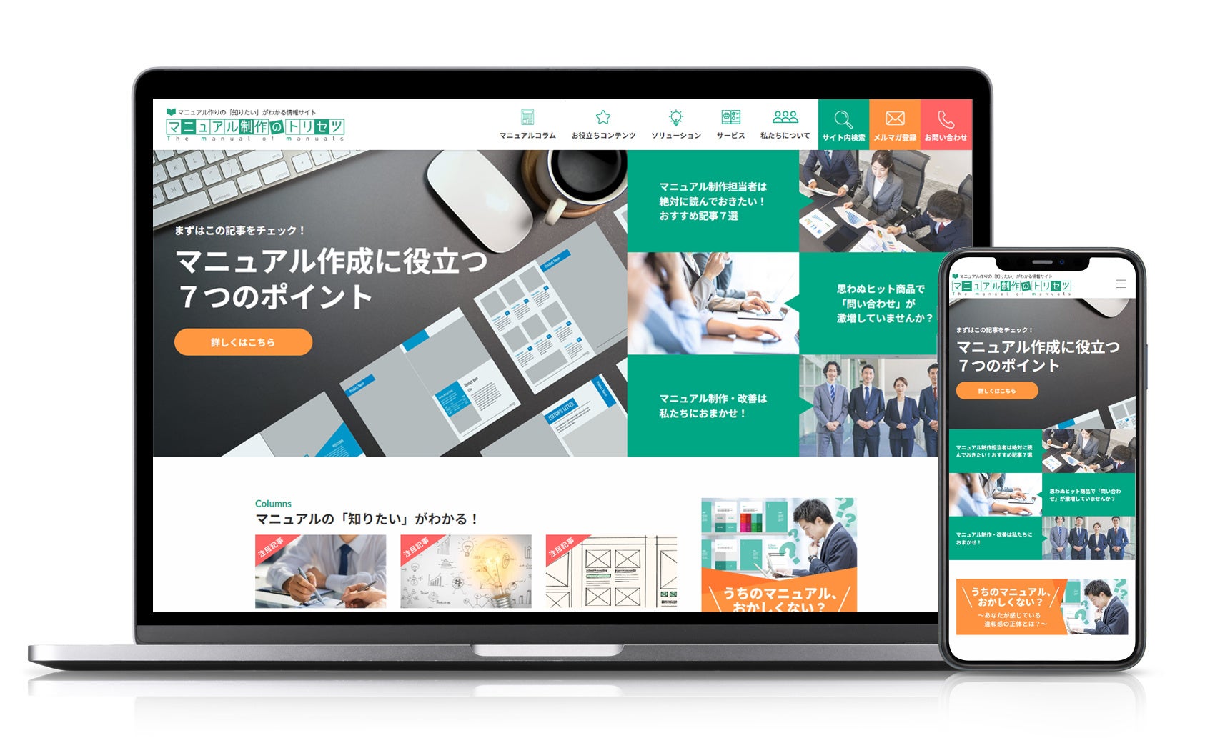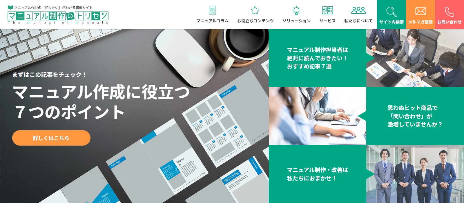 マニュアルの改善は「ヒト×モノ×コト」に関わる全ての質を向上させる効果があります。その改善ノウハウを皆さまにご活用いただけますよう、「マニュアル作りの“知りたい"がわかる情報サイト」として生まれ変わりました。知りたい情報が盛りだくさんのお役立ちサイト「マニュアル制作のトリセツ」をぜひご覧ください。