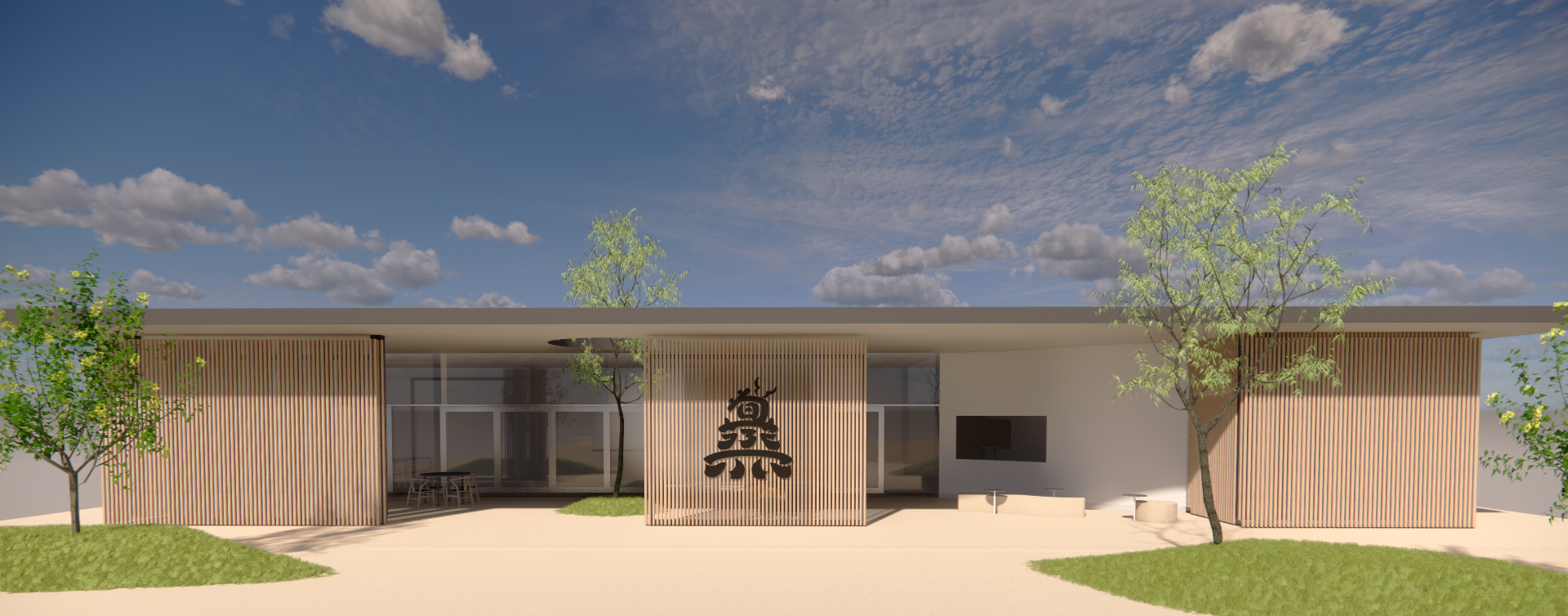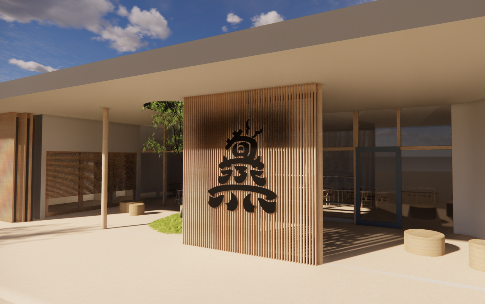 この知覧という土地で「旬蒸terrace」だからこそできる建物を目指し、私達ISNEARはデザイナーと建築家の協働によりネーミング・ロゴ、家具から建築まで一貫してデザインを行なっております。