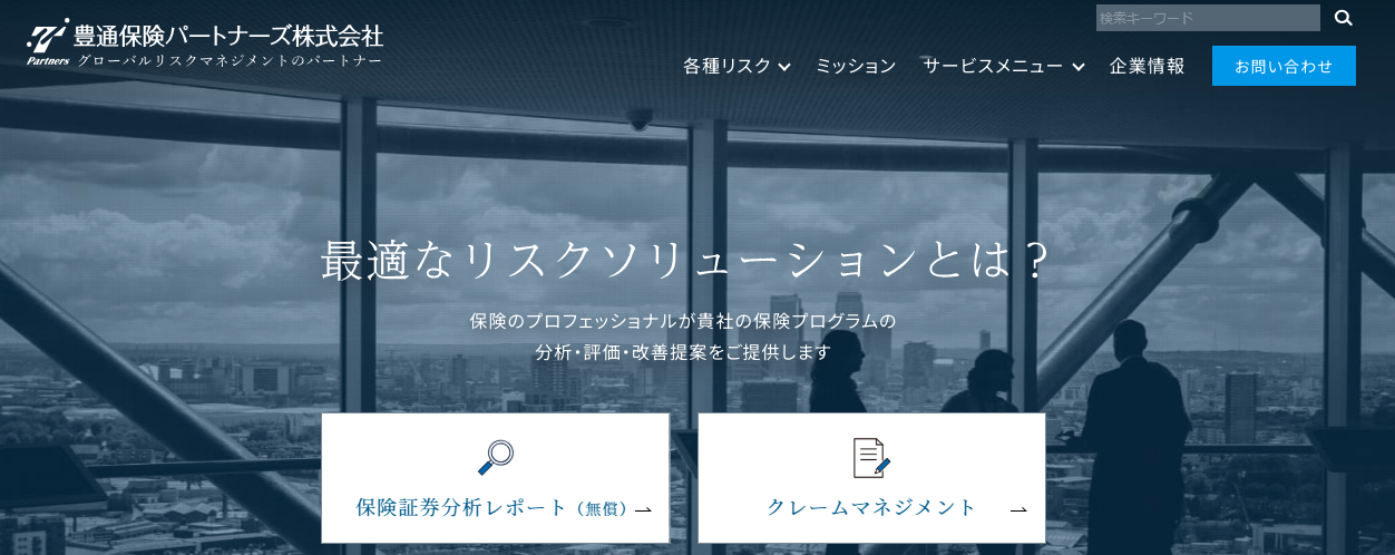 豊通保険パートナーズ(TIP)は、リスクマネジメントサービスに特化した保険代理店です。企業が直面する様々なリスクに対して、「保険証券分析レポート」、「クレームマネジメント」、「ロスプリベンション」、「長期保証サービス」の4つのサービスを提供し、企業の長期的な成功に寄与しております。