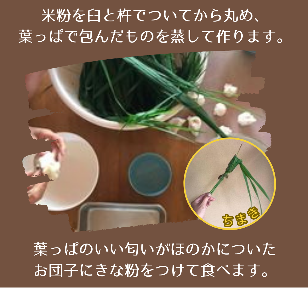 米粉を臼と杵でついてから丸め、葉っぱで包んだものを蒸して作ります。ナラガシワの匂いがほのかについたお団子にきな粉をつけて食べます。