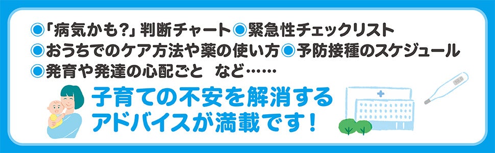 「病気かも?」と思ったときの判断チャートや緊急性チェックリスト、おうちでケアの方法や薬の使い方、予防接種のスケジュールなど、子育ての不安を解消するアドバイスが満載です。年間30,000人の子どもを診る小児科医がわかりやすく解説し、これを読めば初めての育児での不安や疑問をすべて解決することができます!
