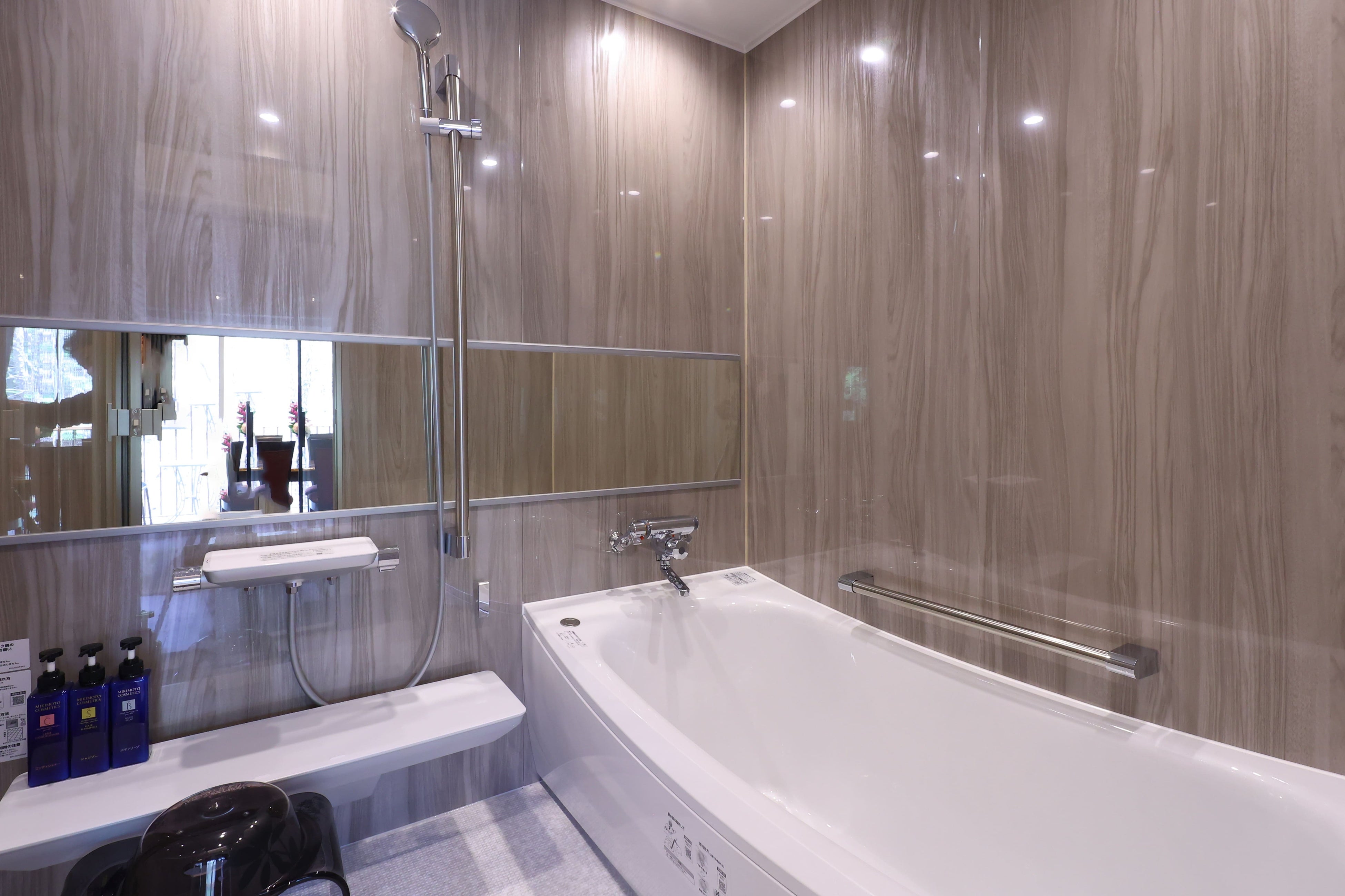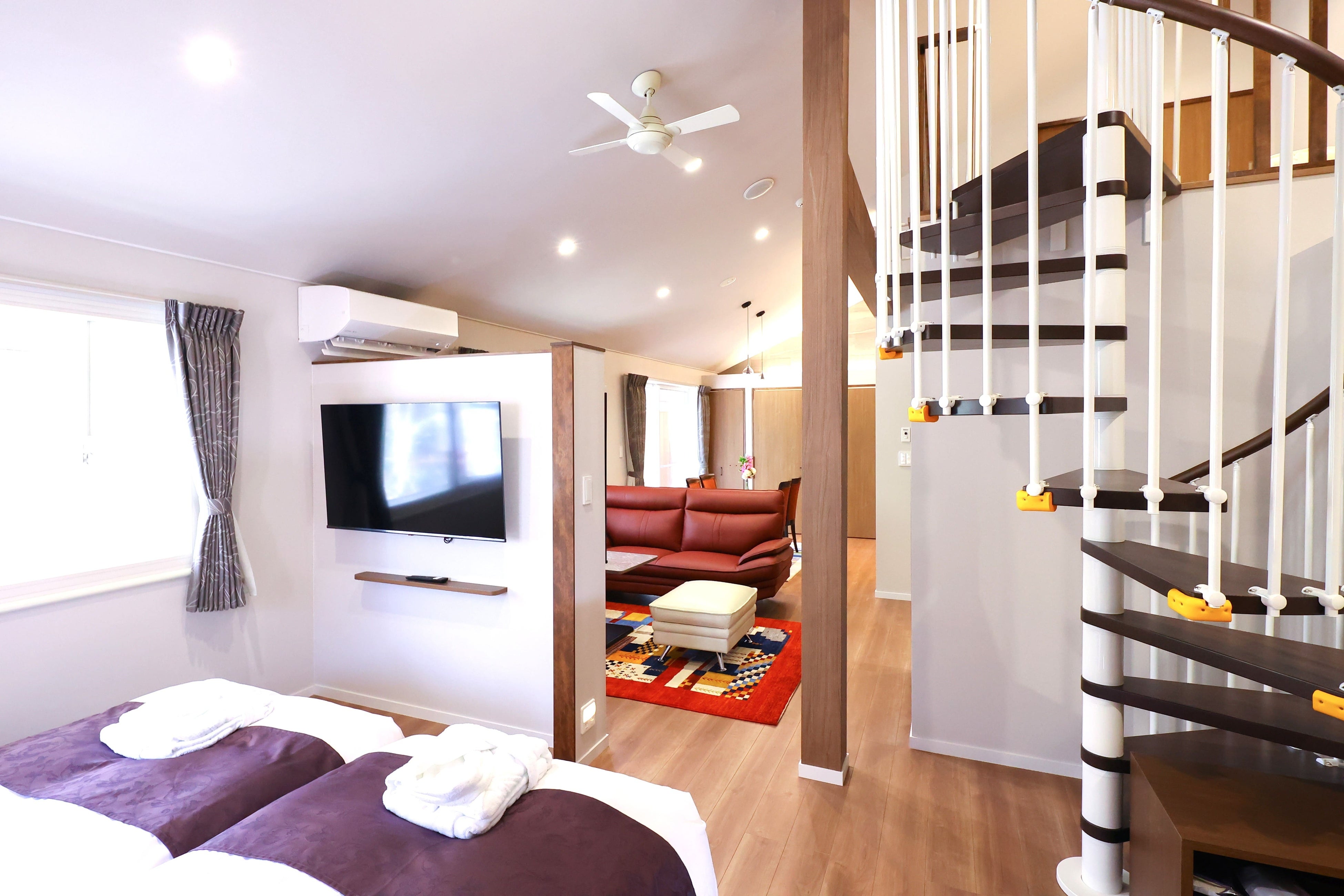 備品・設備:エアコン、スマート機能付きテレビ2台、ソファ、テーブル、ワーキングスペース・デスク、ダイニングテーブル・チェア、冷凍冷蔵庫、電子レンジ、湯沸かしポット、お茶セット、シンク、箸・フォーク・スプーン、お皿、バスルーム、タオルウォーマー、温水洗浄機能付トイレ、空気清浄機、Wi-Fi、USB充電コンセント、