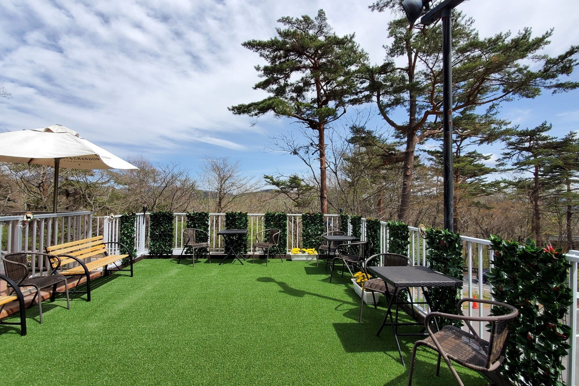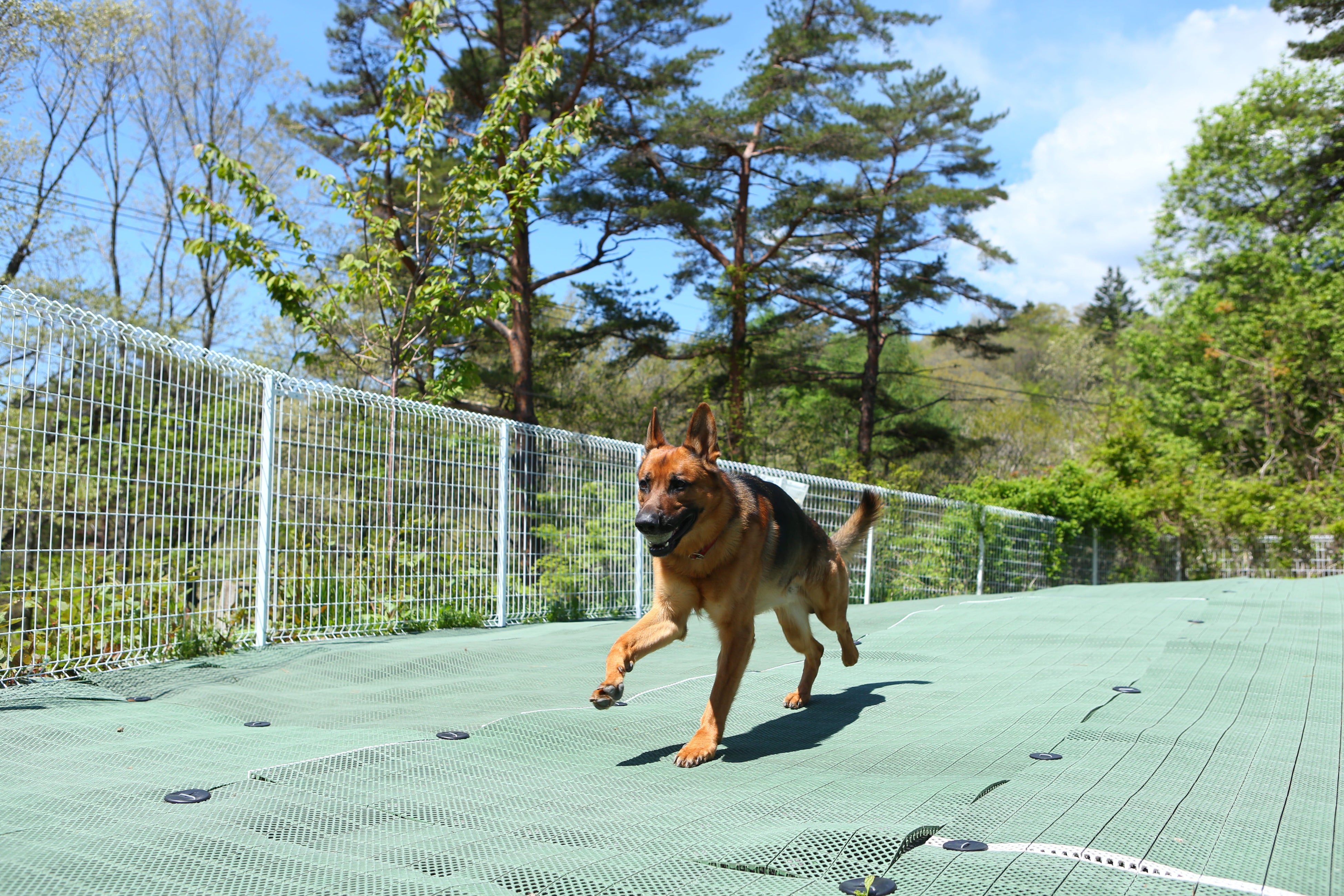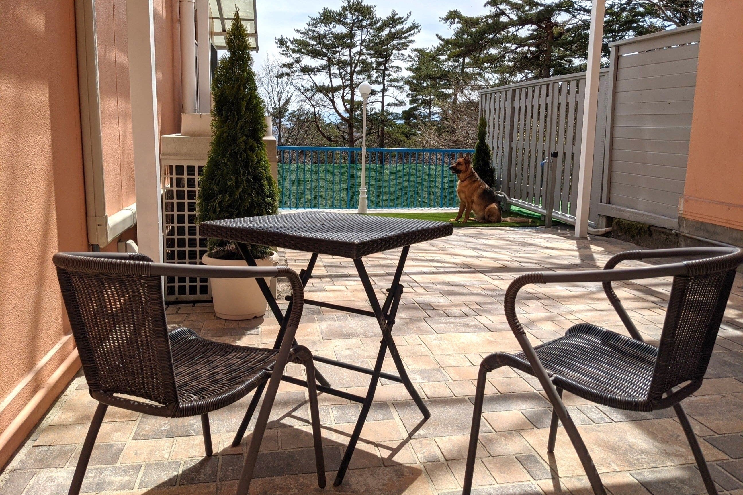 当ホテルではペットと楽しめるフリースペースを3か所設けています。駐車場に併設のドッグコート、館内テラスにあるグリーンドッグデッキのほか、ロビー横には屋根付の中庭のそよかぜパティオがあり、パティオでは雨の日も安心してペットとゆっくり時間を過ごすことができます。(左から、ドッグコート、グリーンドッグデッキ、そよかぜパティオ)