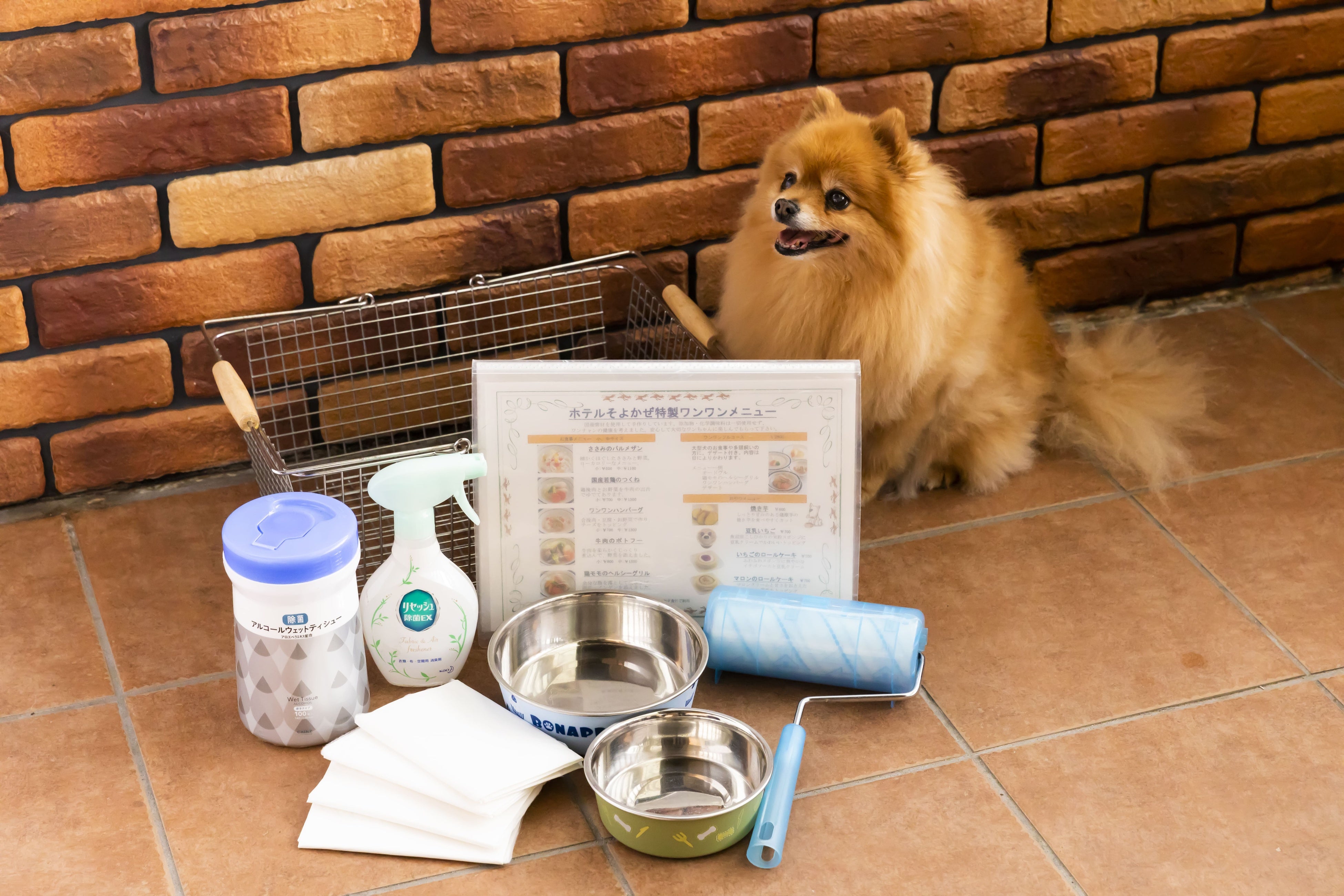 常設ペットアメニティ:折り畳み式の大型ケージ、ペットシート、ワンちゃん用フック、フードボウル、粘着カーペットクリーナー