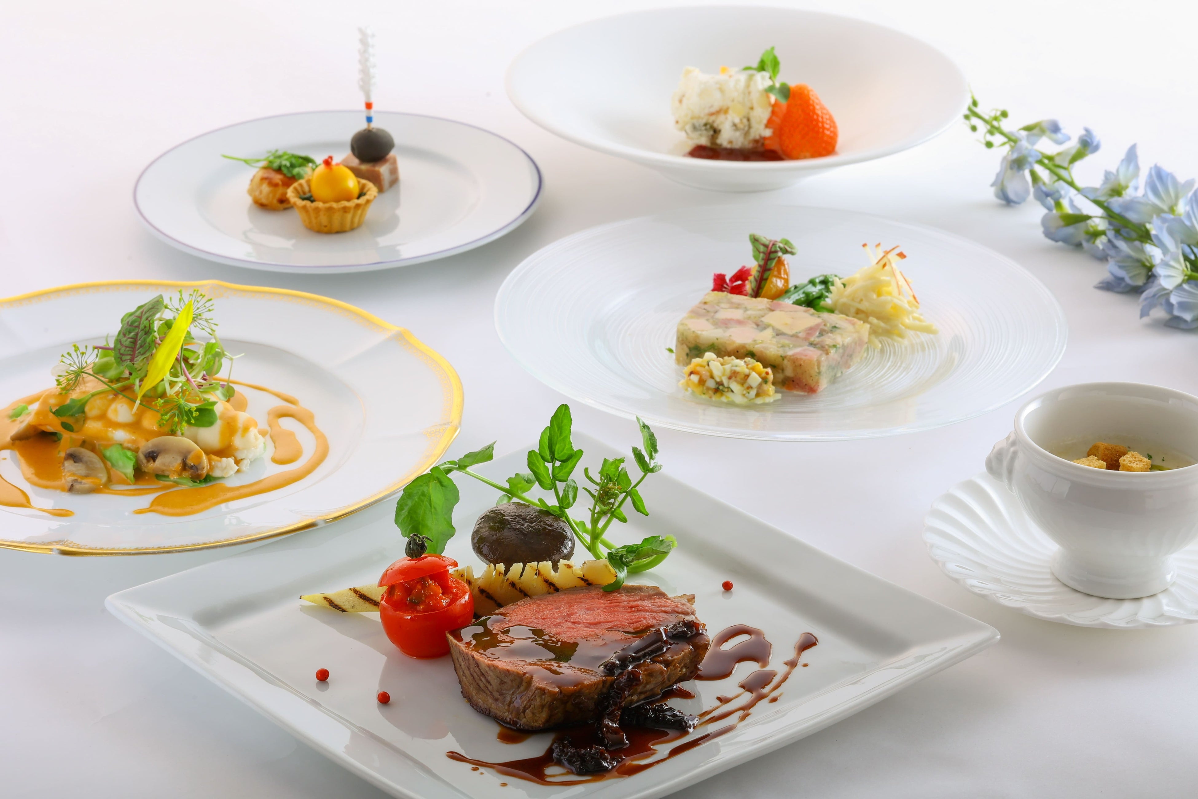お食事はお部屋食にて提供、プライベートな空間でご堪能ください。飼い主様も大切なペットと一緒の空間でゆったりとお寛ぎいただけます。当ホテルは、日本におけるフランス料理の草分けであるアンドレ・パッション氏の協力を得て本格フランス料理を提供しています。パッション氏のレストランで経験を積んだ当ホテルのシェフが手掛けるフルコースは大変好評を得ています。