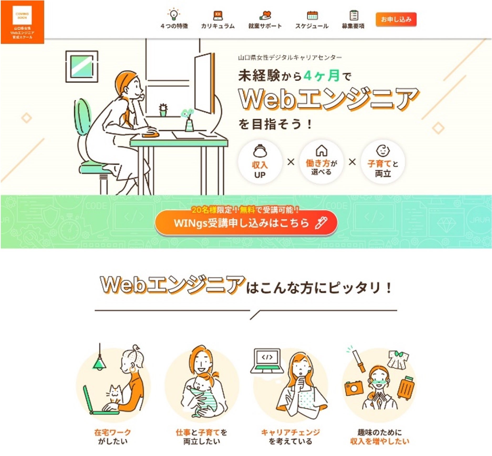 プログラミング基礎講座として、山口女性Webエンジニア短期育成スクール 「WINgs YAMAGUCHI」(ウイングス ヤマグチ)(以下、 WINgs )を9月より開講します。