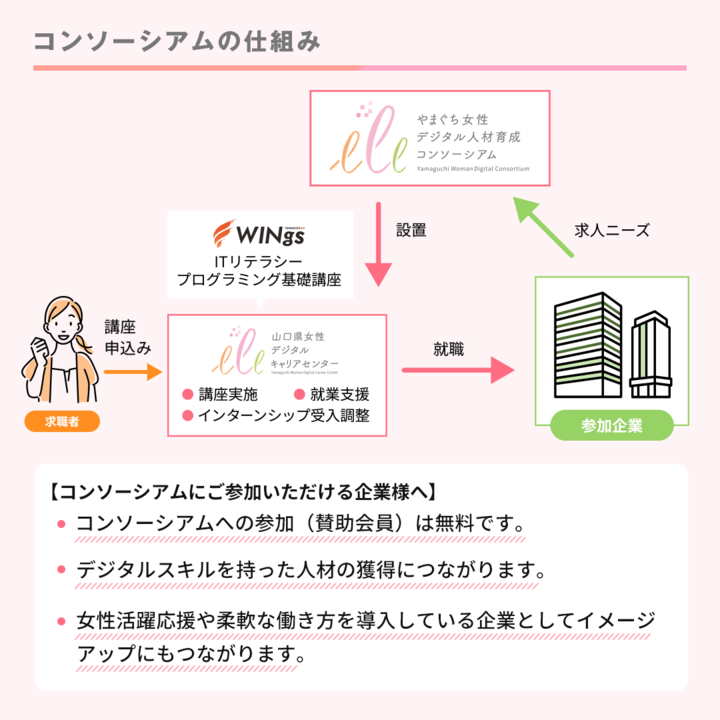 コンソーシアムへの参加(賛助会員)にご興味いただけます企業様におかれましては、下記、「やまぐち女性デジタル人材育成コンソーシアム」設立イベント参加申し込みのフォームより、お申込みをお願いいたします。