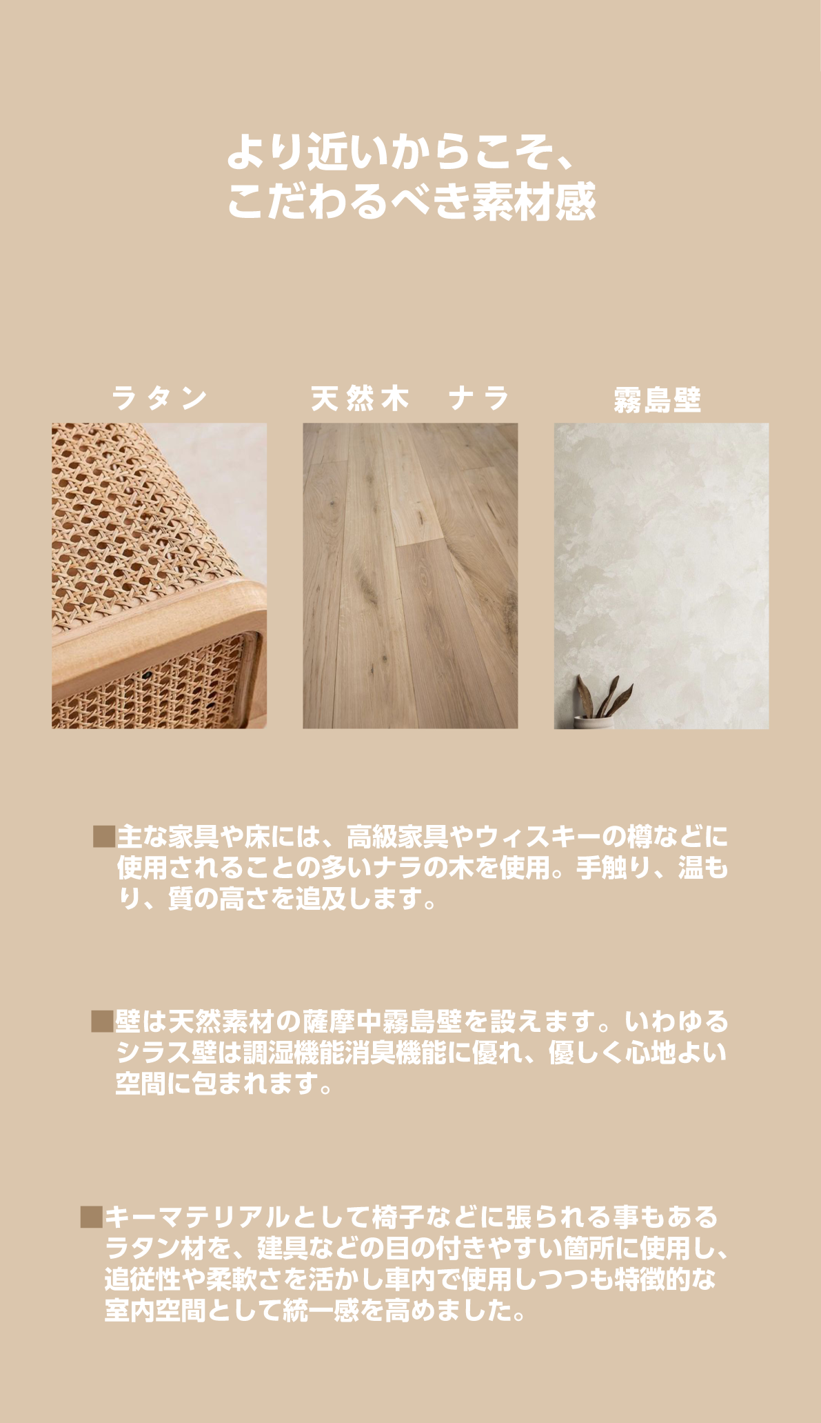 既存のキャンピングカー市場において、内装材は主にプラスチックやフェイクの素材を使用することが多数でした。より生活するように、落ち着いた空間でくつろげるように、内装材には火砕流のシラスを原料とする自然素材で耐久性にも優れるシラス材を壁・天井に使用し、床は素足で過ごすことを前提に考え天然の木材で快適に過ごせる室内環境とします。