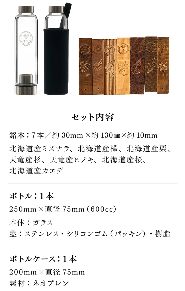 焼き上げ処理を施した国産の銘木を専用ボトルにセットし、お好みのお酒を入れるだけで、手軽に樽熟成酒をお楽しみいただけるキットです。