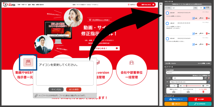 アカポンは、動画データ・YouTube・LPなどのURL・画像から修正チェックができ、昨今、LPサイトや動画を公開する前に欠かせない指示チェックツールとして「会員登録1万社以上」の企業に愛用されています。※招待メンバー無制限・最大2TBのデータ保管が可能。