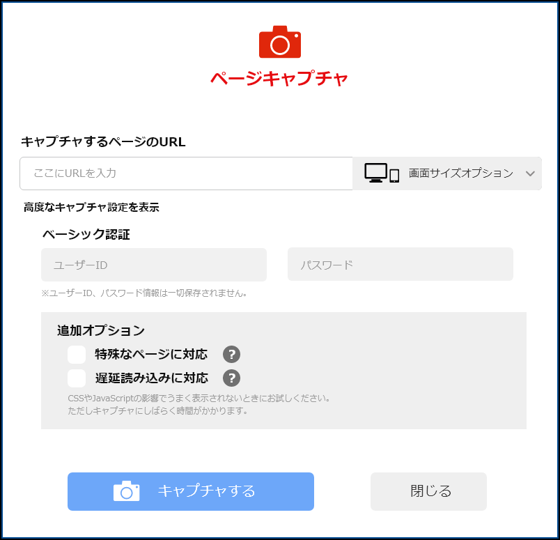 サイト内にCSSやJavascriptなどによる視差効果・パララックス効果(アニメーションなど)を入れている場合は、高度なキャプチャ機能を設定する事でより鮮明なキャプチャが可能になります。