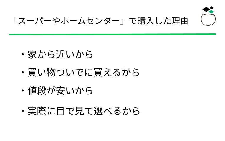 「スーパーやホームセンター」で購入した人の理由は「買い物のついでに購入できる」「家から近いから」と回答した方が9割という結果になりました。また、「値段が安い」という声もあり、気軽に購入できるというポイントが大きいと思います。