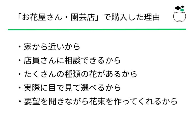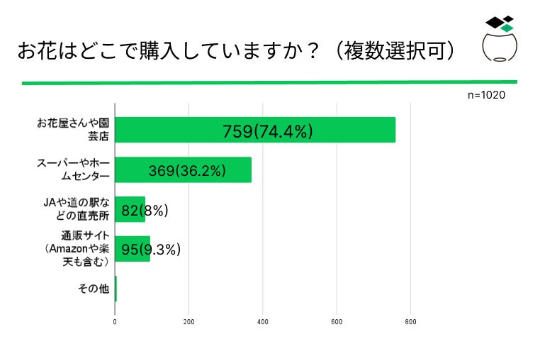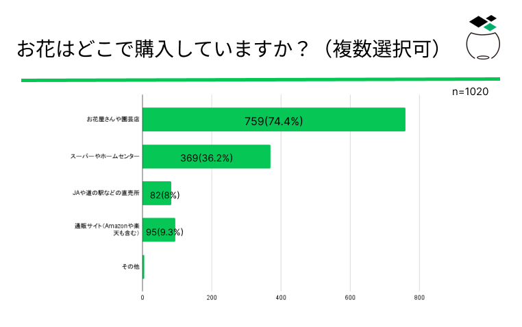 コロナ禍で通販サイトの需要が増しましたが、お花では自分の目で見て選べる実店舗で購入していることがわかりました。