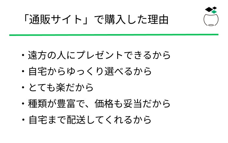 「通販サイト」で購入した人の理由は「自宅からゆっくり選べるから」と回答した人が多く見られました。また、「遠方の人にプレゼントができるから」と回答した方もおり、「母の日や誕生日で利用した」という声も聞けました。