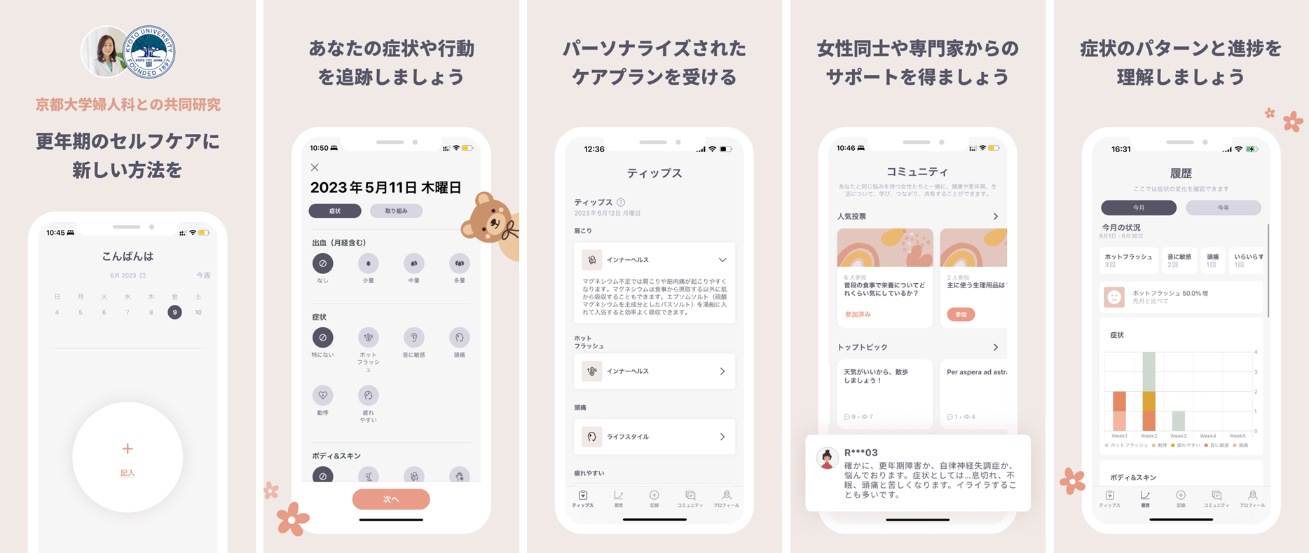 2023年4月1日に京都大学と共同研究を締結しました。更年期に関する探索的研究を実施し、更年期セルフケアの科学的エビデンスを構築することを目指します。江川先生にはアプリ開発監修者として、産婦人科指導医・女性ヘルスケア指導医としての医学的知見と京都大学医学部附属病院で10年以上専門的診療に従事した経験に基づき、アプリ開発などをご支援いただきます。 今後、更年期のデジタルヘルスケアアプリを用いた実証試験の設計・実施も共同で推進する予定です。