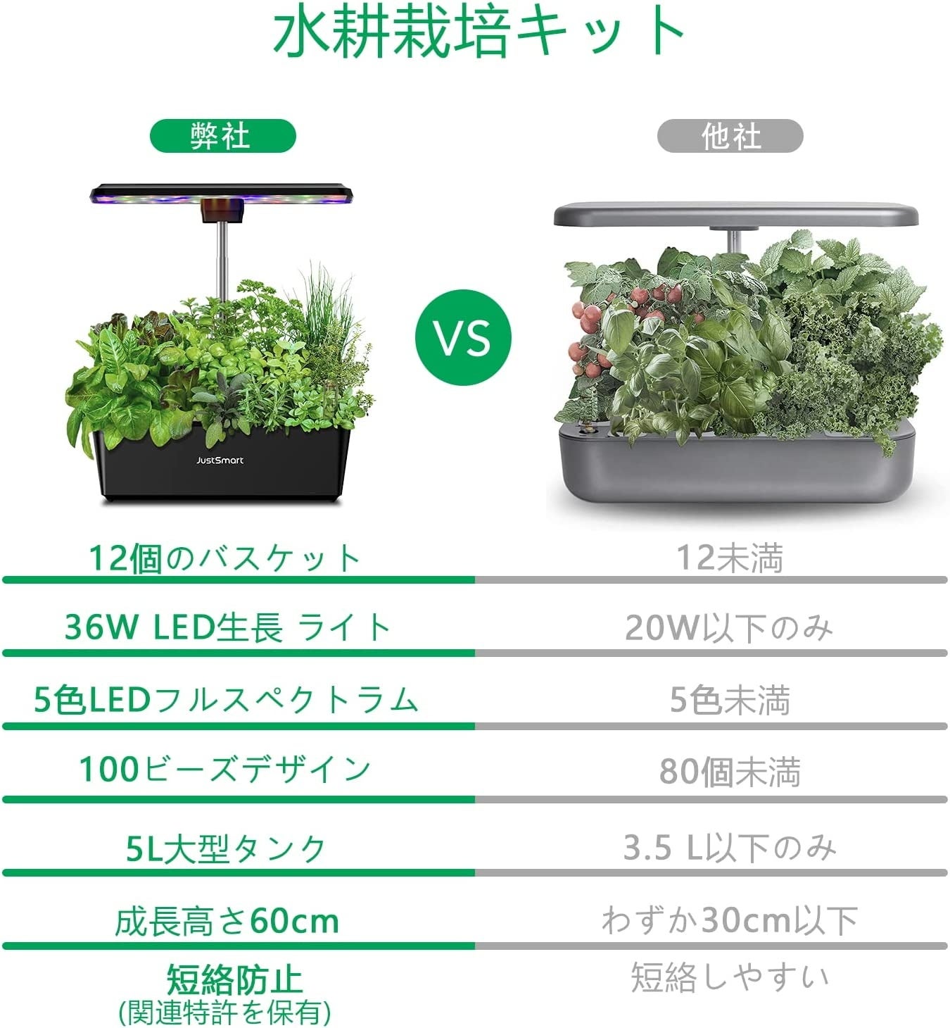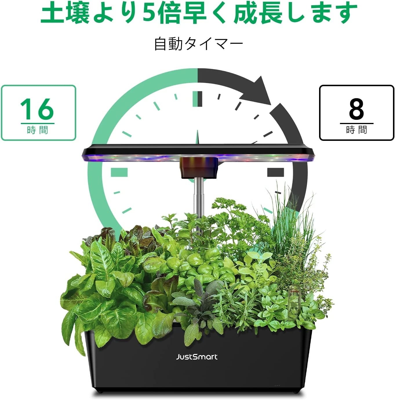 JustSmart水耕栽培キットには、すべての必要な機器や資材が含まれており、簡単に始めることができます。セットアップも簡単で、操作パネルを使って栽培条件を調整するだけで、野菜の成長を管理できます。LEDライトが内蔵されているため、日光の不足する場所でも安定した光環境を提供し、植物の光合成を促進します。