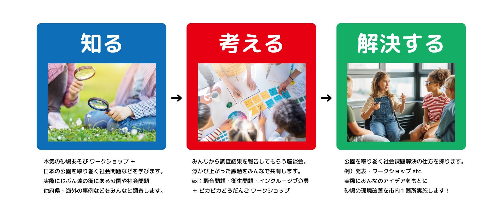 近年、公園をめぐる問題は多種多様にわたります。「砂場が衛生的でないのはどうしてだろう?」「公園でボールあそびできないのはなんでだろう?」「私たちの声ってうるさいのかな?何dBなの?」「インクルーシブ遊具って本当はどんなのがいいの? 」など、これらは、こども達と共に考え、解決を試みるべき様々な社会的課題の一部です。「SUNABANASHI」では、これらの問いを共有し、こども達と一緒に解決策を見つけるための取り組みを推進しています。