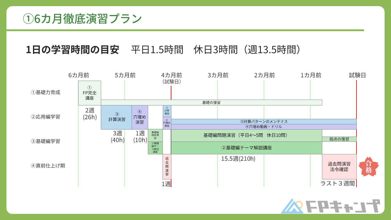 FPキャンプでは、上記4つの講義をどのようなスケジュールで進めるべきかを、その人ごとの余暇時間をベースに3つのプランで紹介しています。