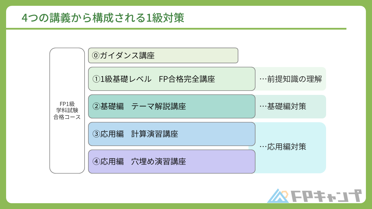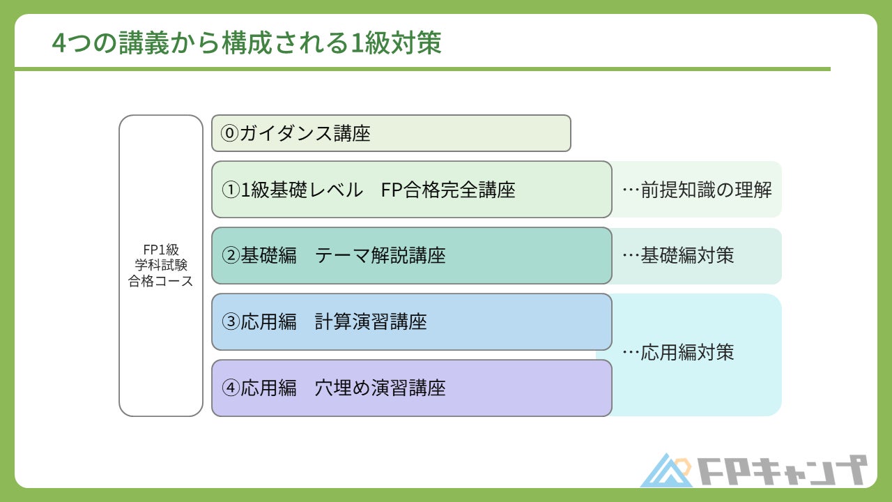 FP1級の学科試験は午前の基礎編と午後の応用編に分かれており、応用編は計算問題と穴埋め問題の2パターンの形式で出題されます。これらの問題を攻略するために以下の4つの講義で対策します。