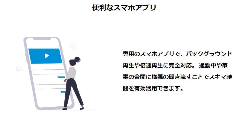 さらに高速で周回するための「倍速機能」やスマホを閉じていても音声の再生ができる「バックグラウンド再生機能」、学習の完了度が可視化できる「進捗管理グラフ」にも対応しているため、より効率的な学習も可能です。