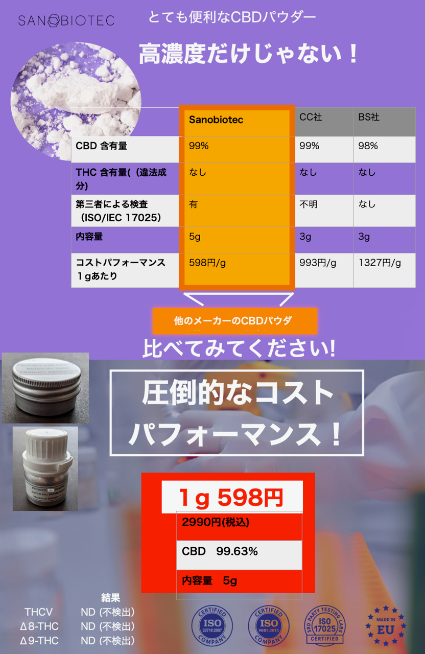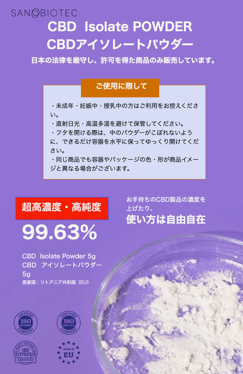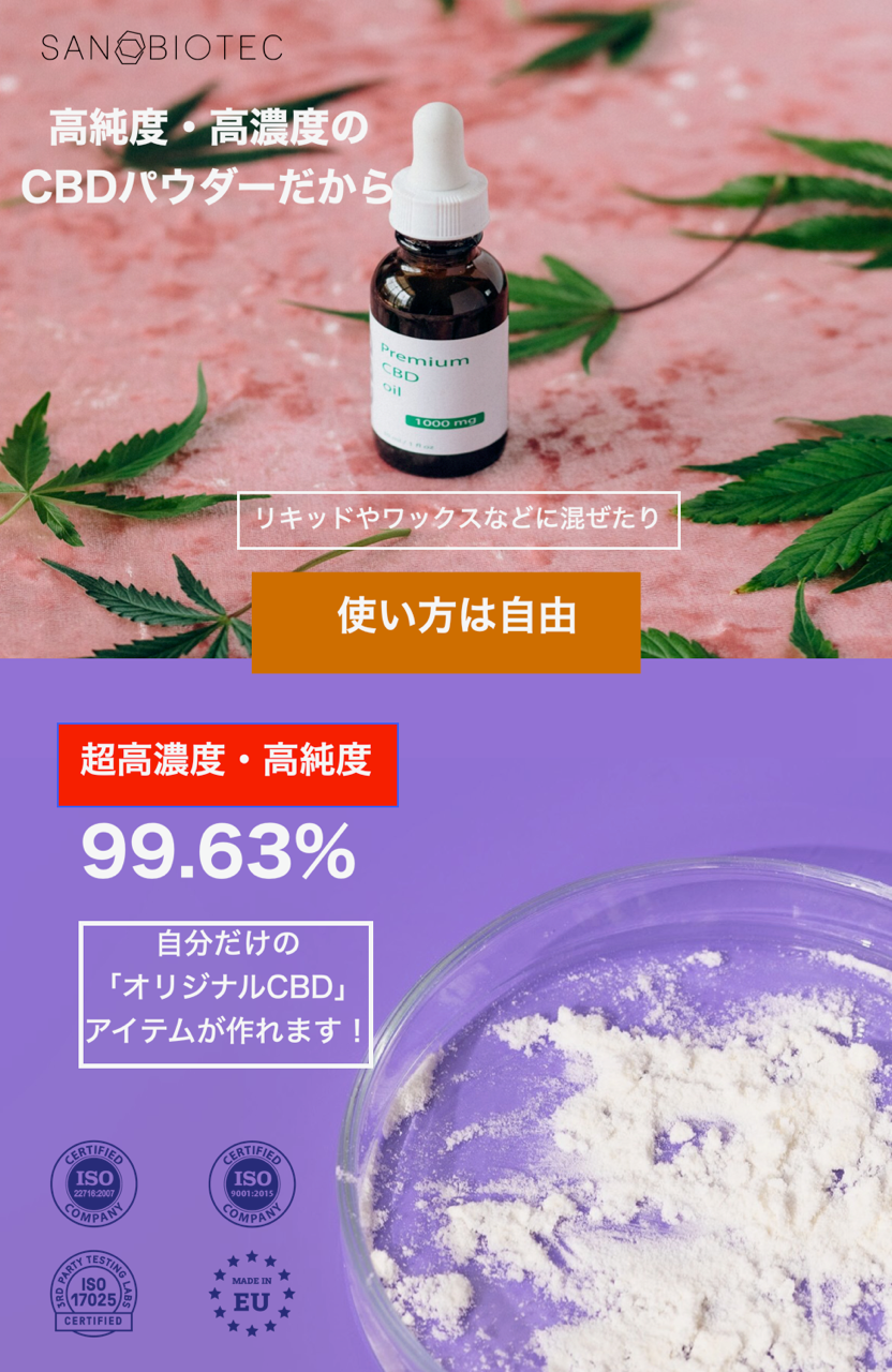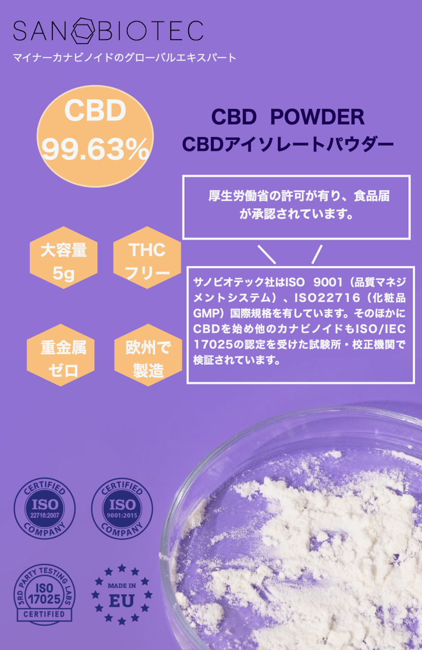 製造元であるSanobiotec社は世界的なカンナビノイド原料メーカーです。オイルやリクイッドだけでなく、アイソレートも製造しています。メジャーなCBDやCBGだけでなく、マイナーカンナビノイドと呼ばれるCBN、CBC、CBDV、CBGA、CBDAについても長年研究、製造している老舗企業です。同社が提供する高純度のアイソレートは、ウェルネス、化粧品、食品関連市場において高い評価を受けています。