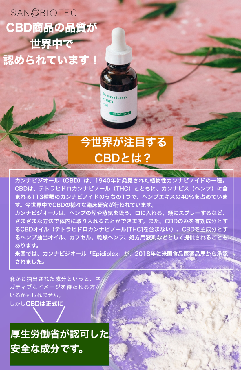 弊社が日本に輸入しているCBD、CBN、CBGはすべて厚生労働省から食品グレードの認可済みのアイソレートパウダーとなります。小売販売、または加工製品の原材料としてのご利用が可能です。