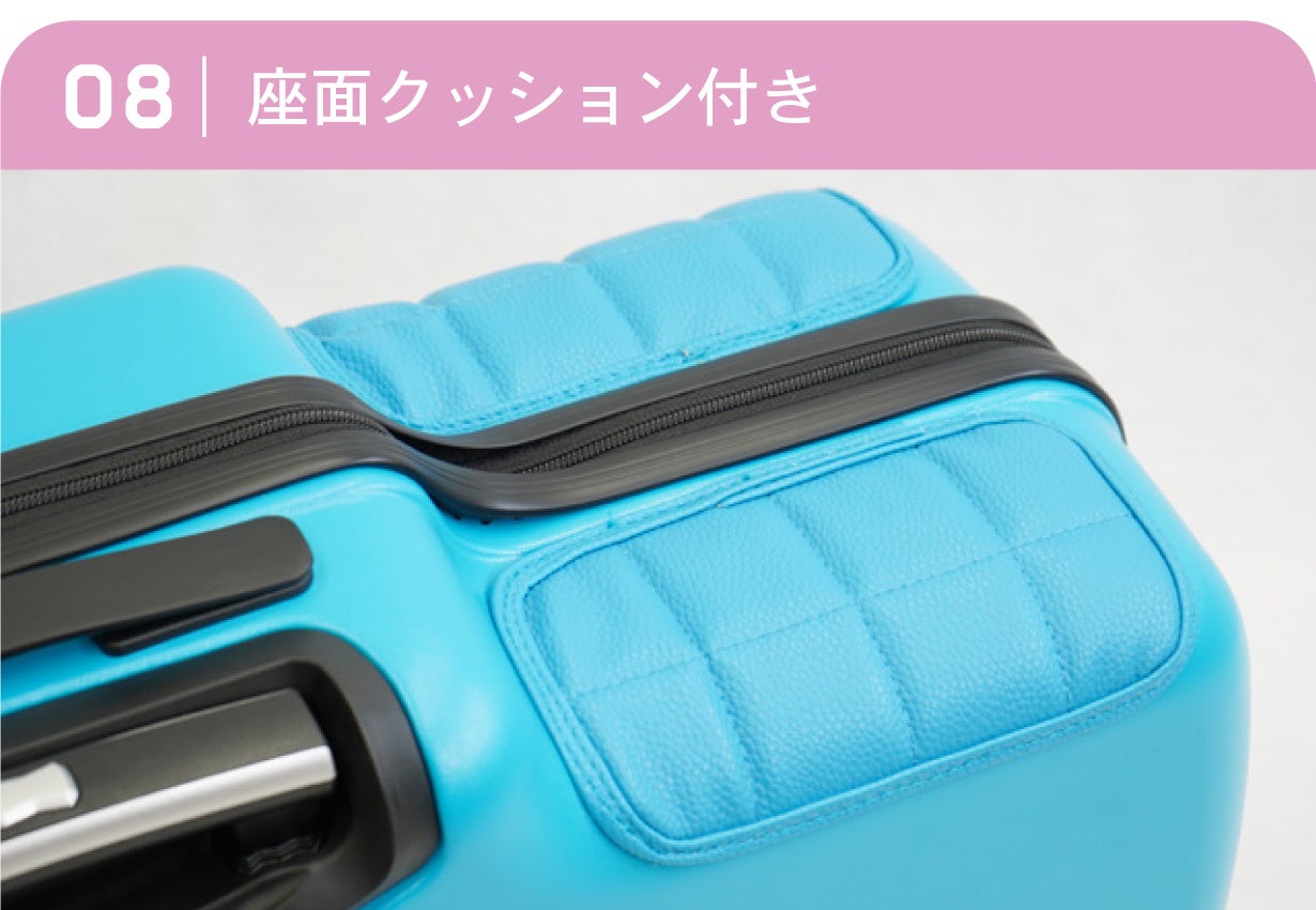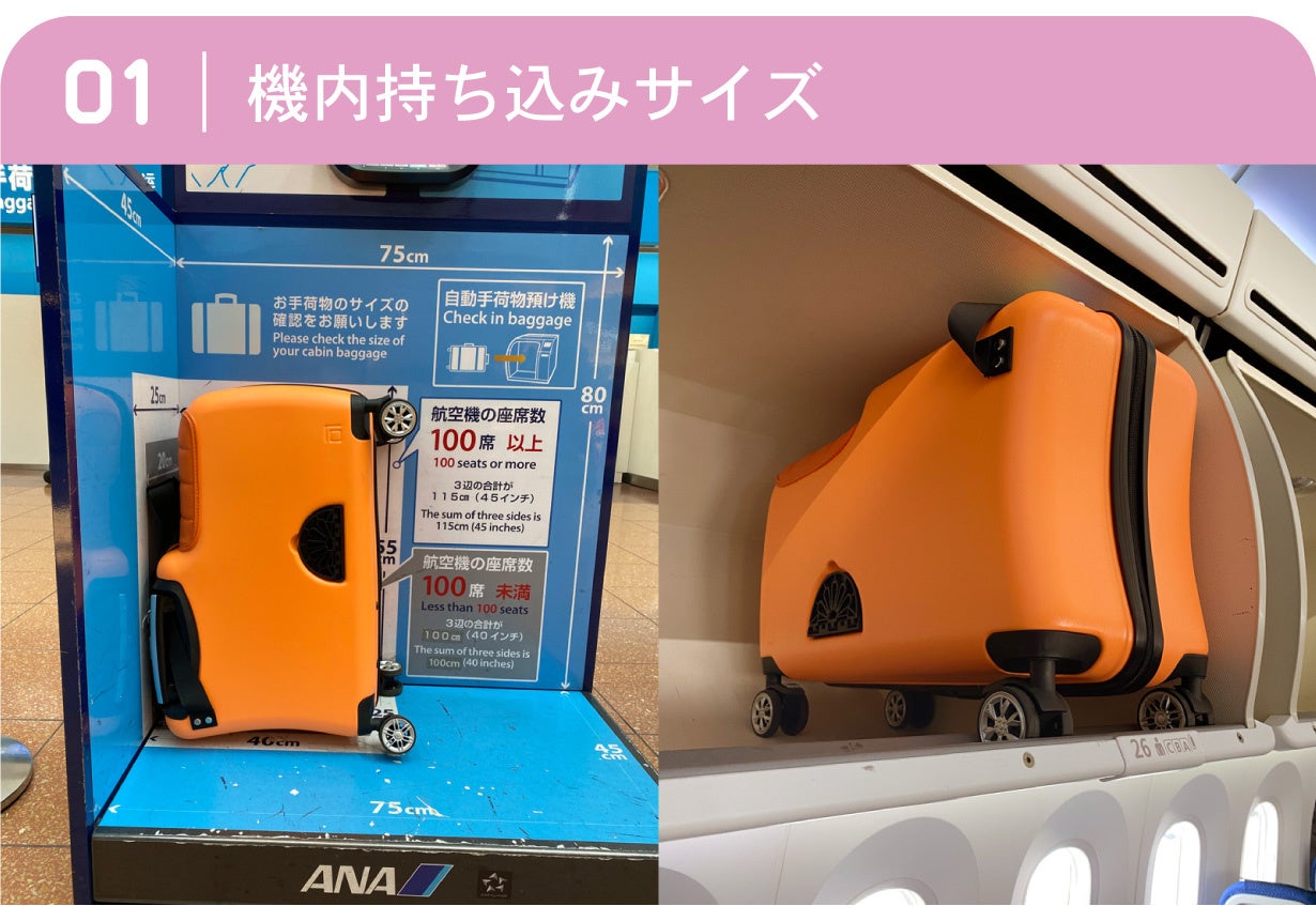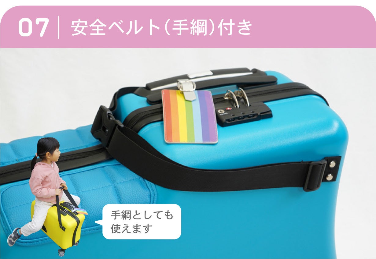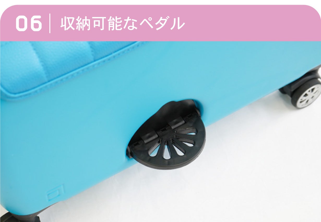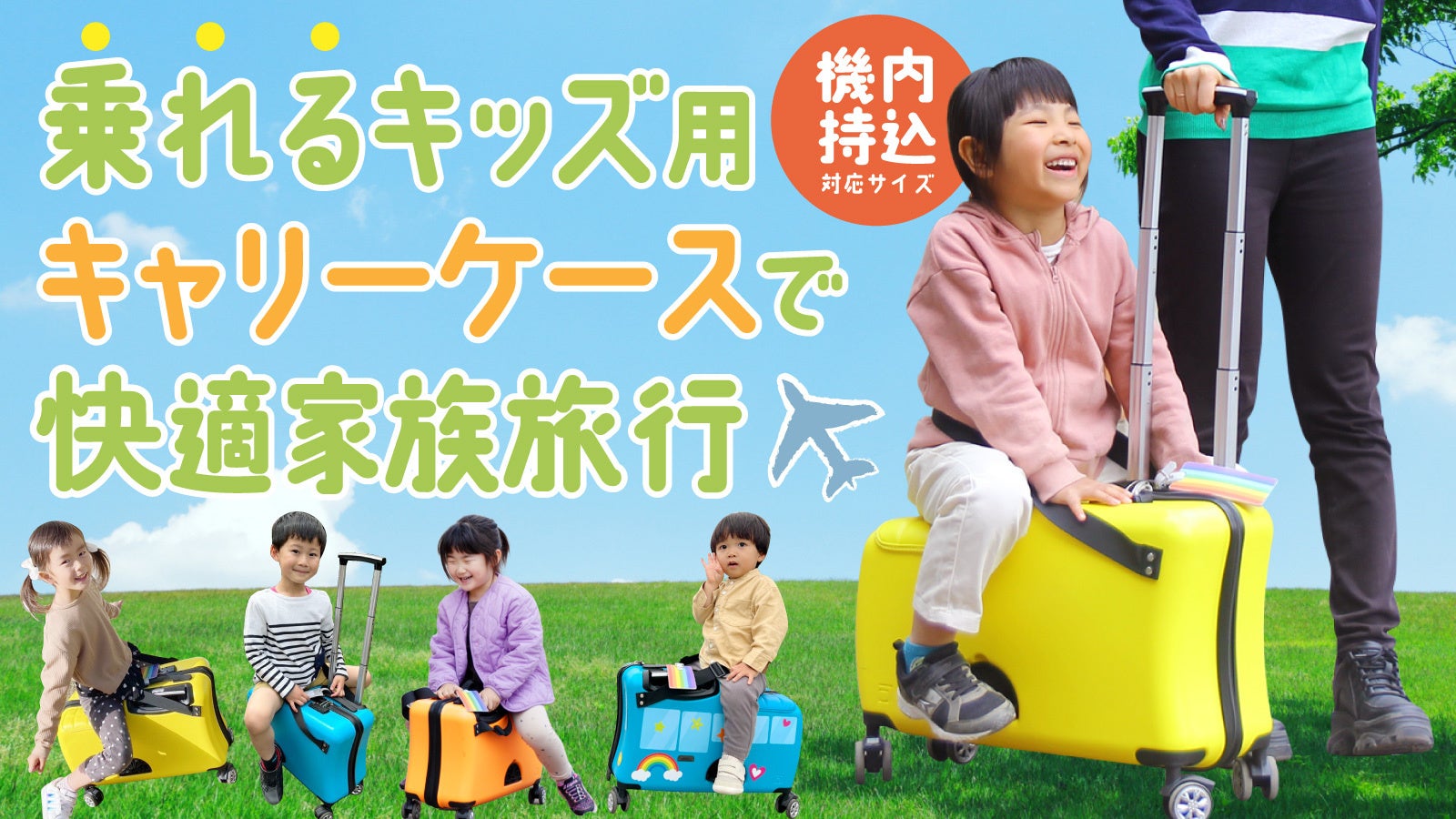 子供がワクワクして自ら乗りたくなるデザインで家族旅行の負担が軽減。機内持ち込みが可能なサイズで空港での煩わしい待ち時間が不要な乗れるスーツケースを独自開発いたしました。