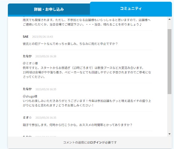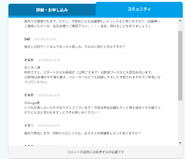 「コミュニティ」では、主催者や他の参加者と直接チャットでやりとりをすることが可能です。オープンチャットにすることで、主催者がイベント登録ページに書ききれない想いを伝える場としてご活用いただいたり、ユーザーがイベントに参加するにあたって、不安解消や事前コミュニケーションにお役立ていただければと思い、このような機能も搭載しました。