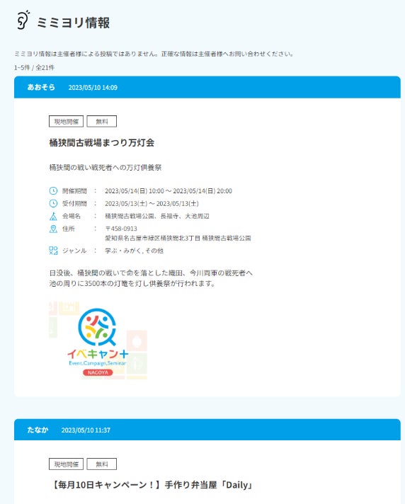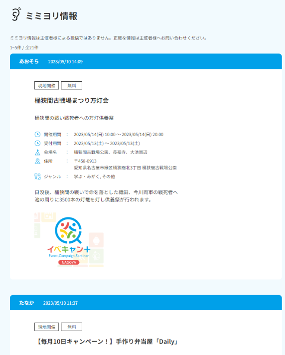 「ミミヨリ情報」では、主催者でなくても、イベント情報を投稿することができます。いきたいと思ったイベントや参加してよかったイベントをSNS感覚で他の利用者にシェアすることができます。