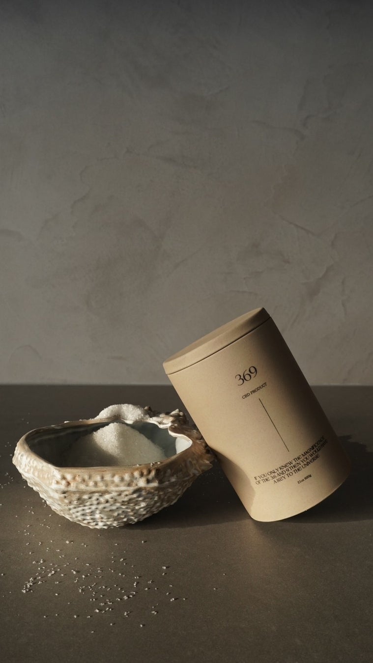 369のCBDバスソルトは、独自の製造技術から生まれた乳化剤不使用の水溶性CBDパウダーを使用。