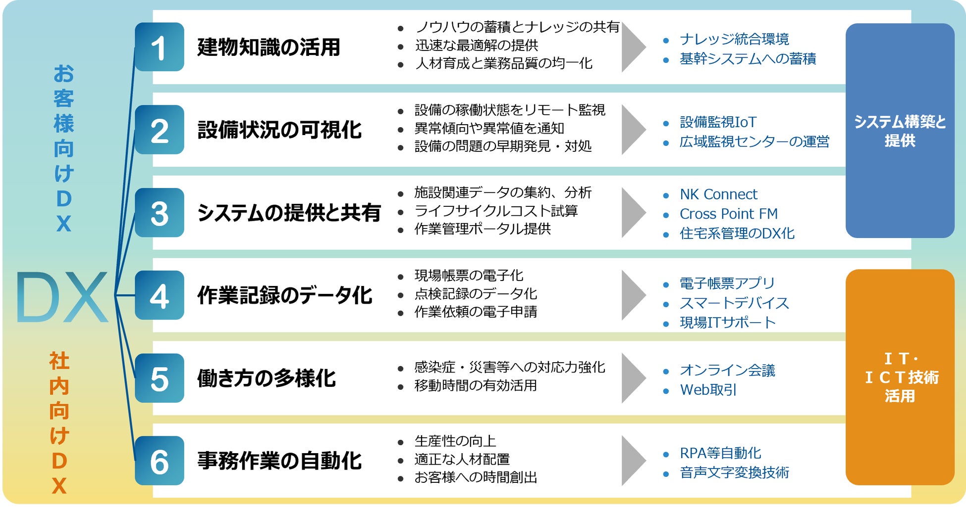 当社グループは、高齢化や人手不足等の社会課題への対応として、業務のデジタル化及びDX化を積極的に推進しており、業務の効率化とお客様へのサービス価値向上に努めています。今後も、積極的にDX化に取り組むことで、高度な施設管理と持続可能な社会の実現を目指してまいります。