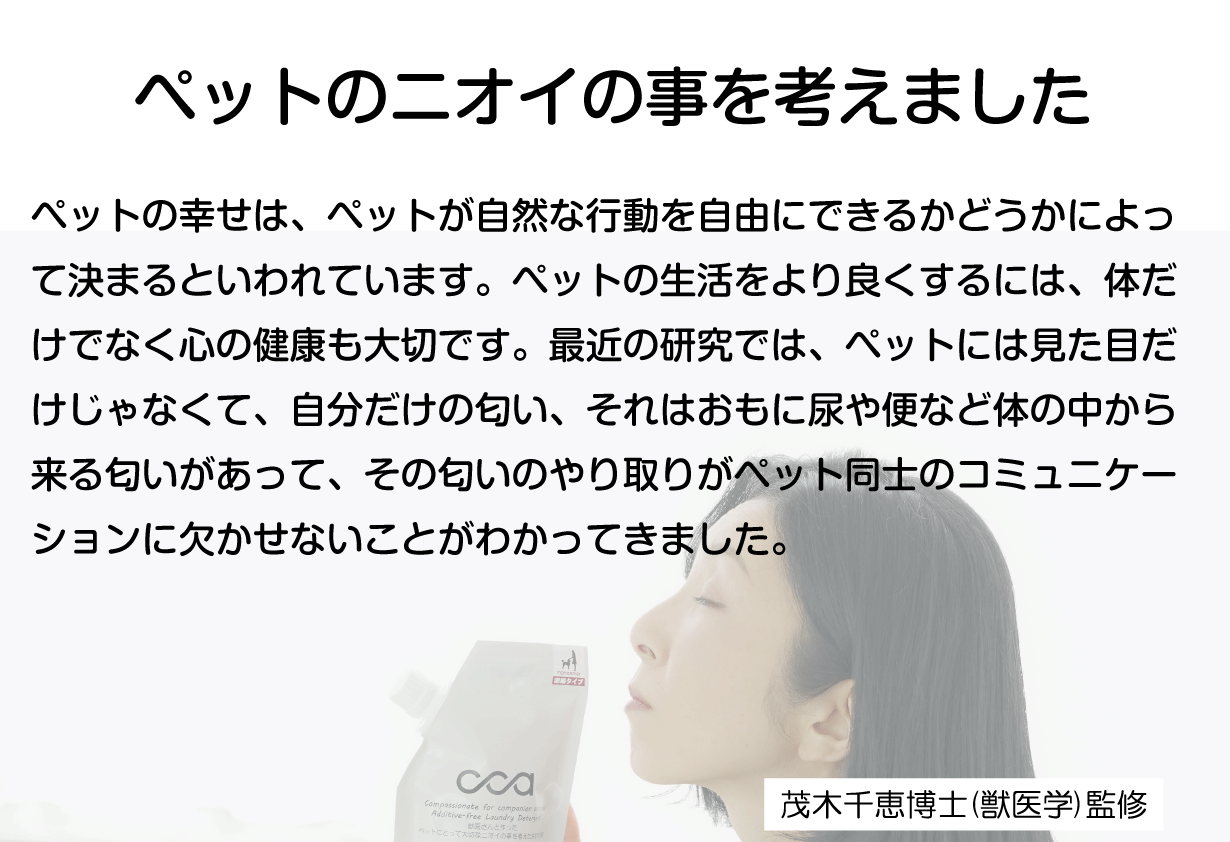 ペット同士のコミュニケーションにとって重要な役割を果たす、ペット自身の「ニオイ」。その独特なニオイは、ペットの個性とも言えます。しかし、日常の洗濯でそのニオイを落としすぎてしまうことはありませんか?我々は、動物行動学を専門とする獣医師・獣医学博士と共同で、ペット自身の「ニオイ」を適度に保護しつつ清潔に保てる洗濯洗剤を開発しました。その名も「シーシーエー獣医さんと作ったペットにとって大切なニオイの事を考えた洗濯用洗剤」。この新しい洗濯洗剤のクラウドファンディングが6月12日より、Makuakeで開始されます。