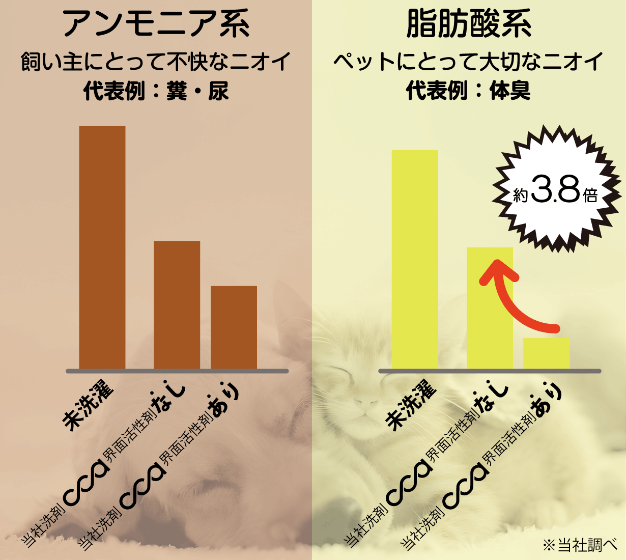 私たちは、洗濯洗剤がペットにとって大切な香りを洗い落としすぎないよう配慮しています。しかし同時に、飼い主さんが感じる不快な香りは効率的に洗い落とすことを目指しています。