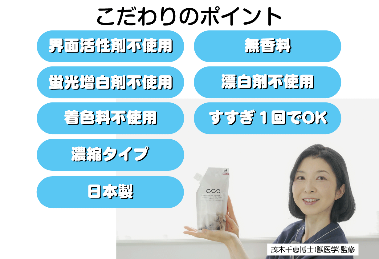 "当社の製品への独自のこだわり:ペットと飼い主のために設計された洗剤"