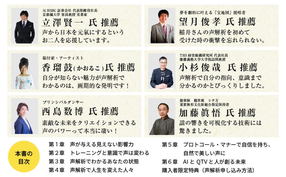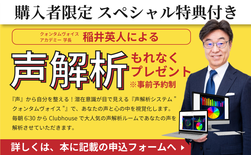 現在、私たちが運営しているクォンタムヴォイスアカデミー( https://qtv-academy.jp/ )では、「声解析」という独自のシステム「クォンタムヴォイス( https://qtv-ac.com/ )」を用いて、声に現れるその人の資質や心身の状態を可視化し、「本来の個性や才能を引き出すためにはどうしたらいいか」などの講座を設けています。