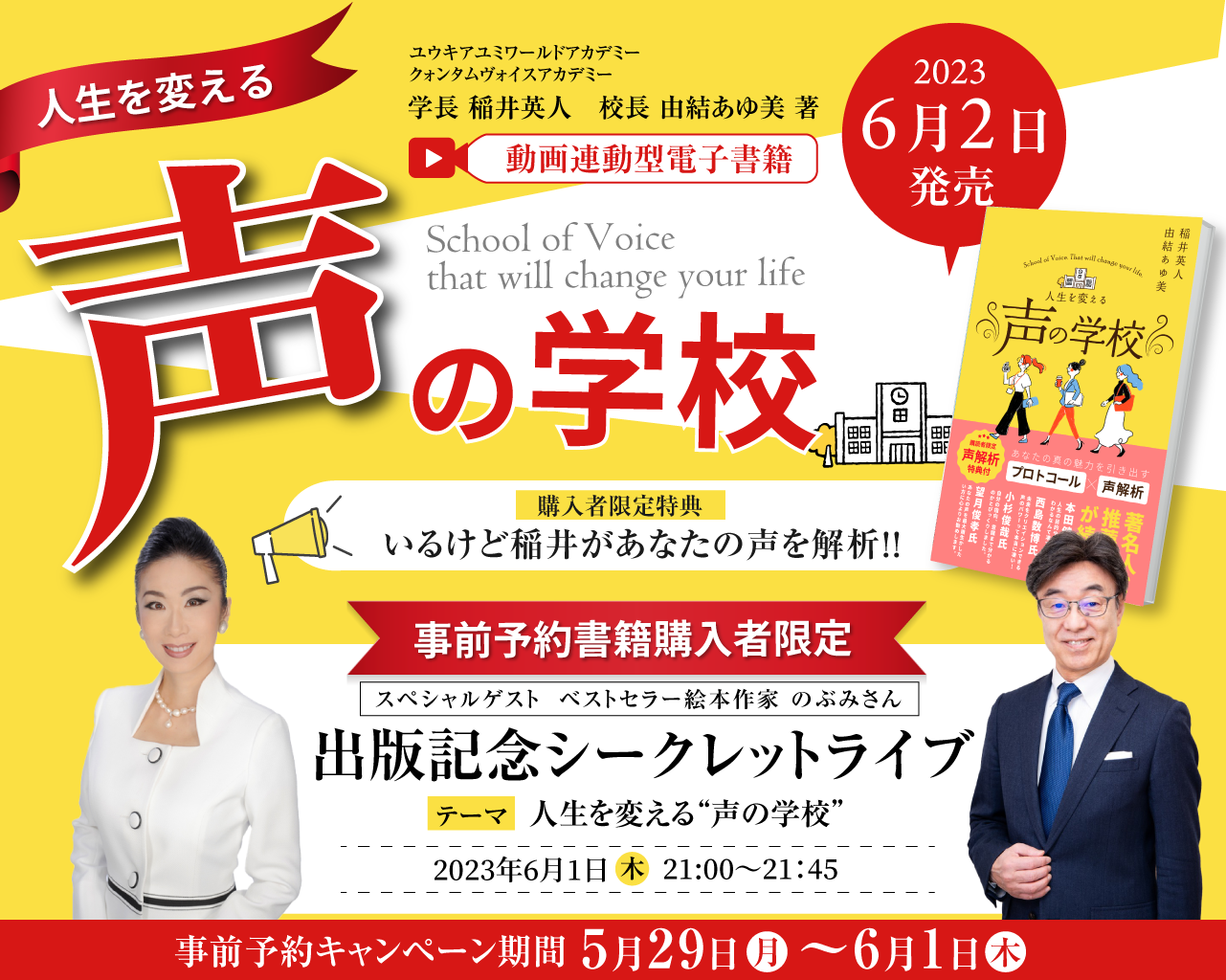 クォンタムヴォイスアカデミー(東京都新宿区)学長 稲井英人と校長 由結あゆ美は、2023年6月2日に『人生を変える“声の学校“ -あなたの真の魅力を引き出すプロトコール×声解析-』を刊行します。(2023年5月29日より事前予約スタート)