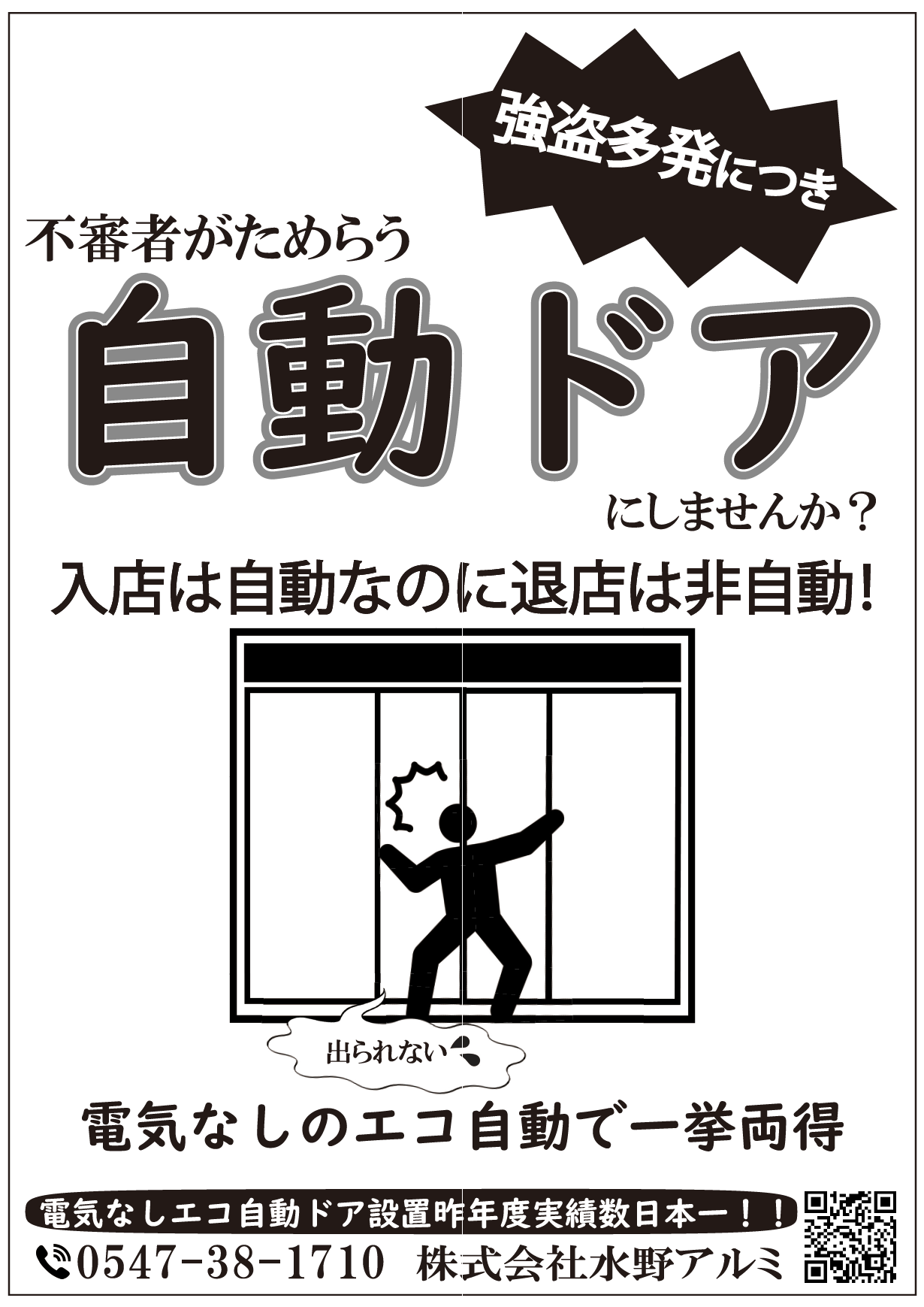 水野アルミでは昨今のニュースを機に、店舗や自宅の防犯対策の手段のひとつとなる入り口ドアのリフォーム需要の高まりに対し、開発した商品を広めるためにチラシを作成しました。今後、このチラシと共に全国の都心を中心にセールスプロモーションを行ってまいります。