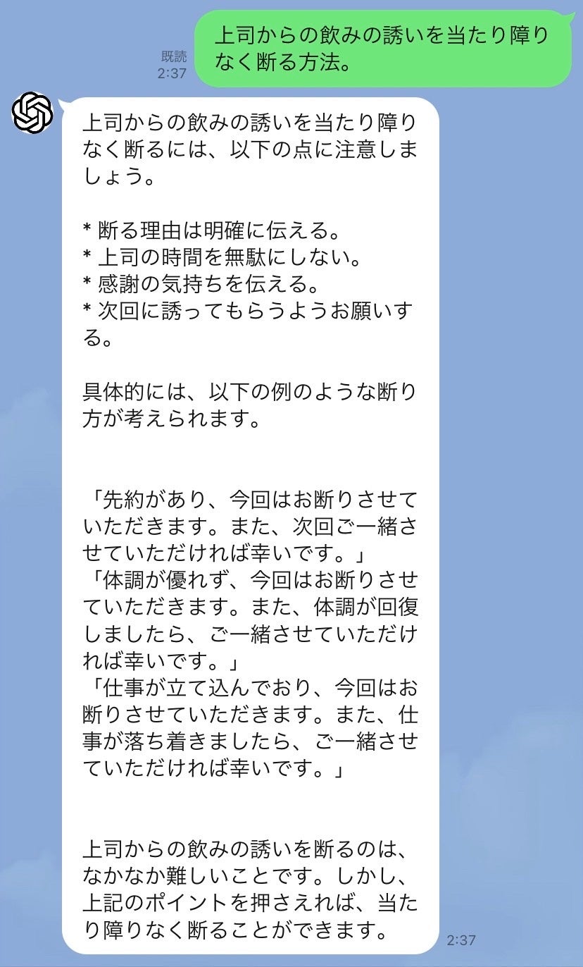 LINEで手軽に話題の最先端AIチャットができるサービスです。友達追加するだけで会話をはじめることができ、献立作成からビジネスメールの作成、人生相談までなんでもチャットで答えてくれます。ご利用料金は、毎日5通まで無料。月額480円のプレミアムプランに加入することで無制限のチャットが可能になります。
