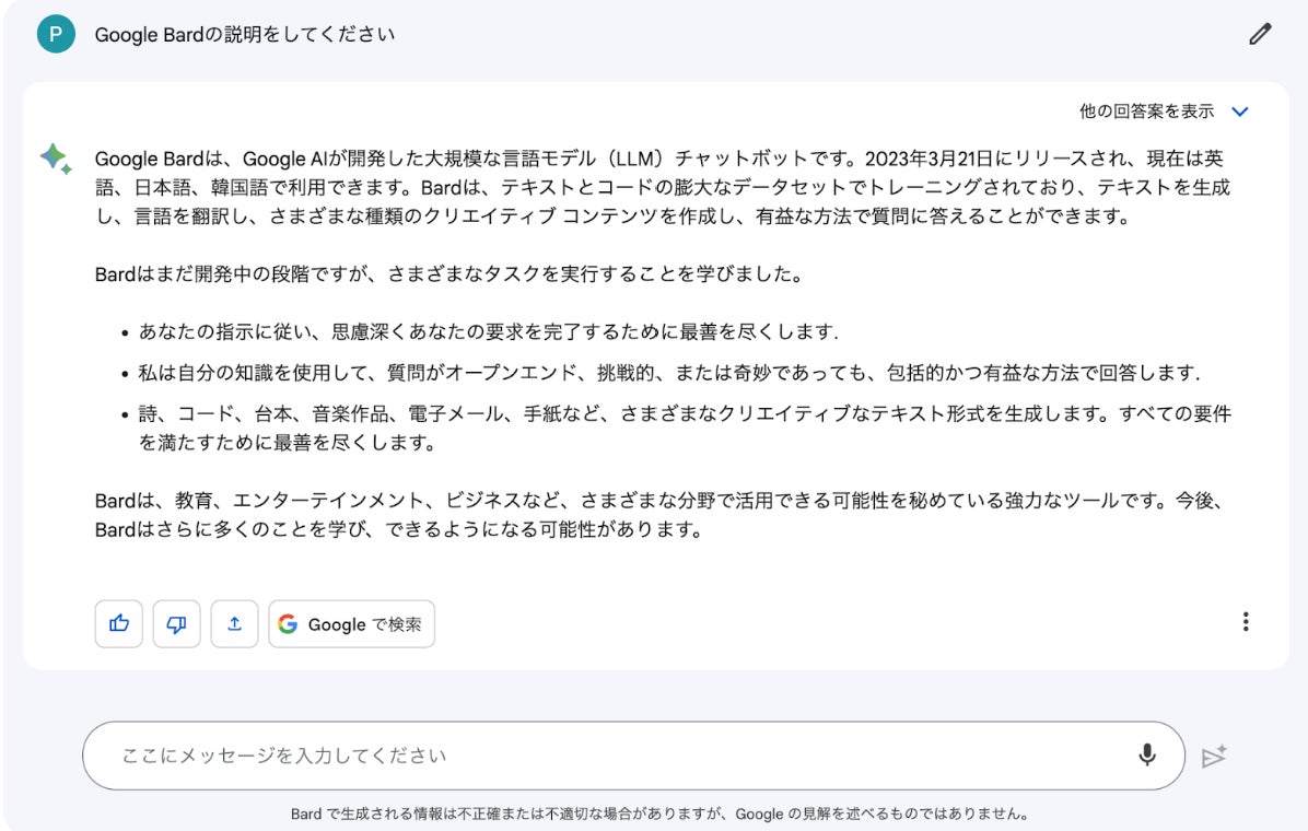 「Bard」はGoogleの膨大なデータセットと検索インフラストラクチャにアクセスできることで、より正確で有益な回答を提供できる点で優れています。