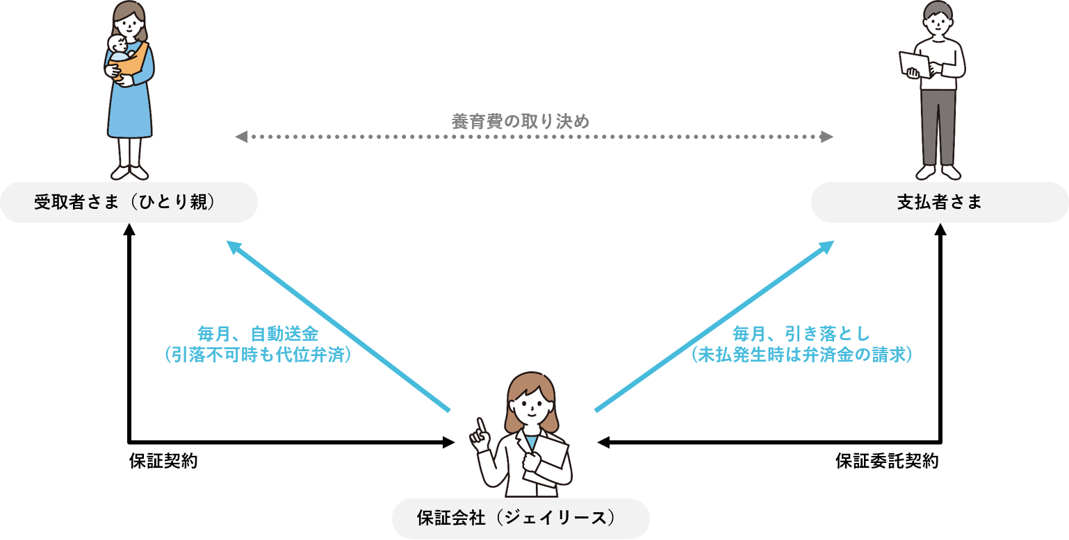 養育費受取者の保証料負担により、「養育費支払者、養育費受取者、ジェイリース(保証会社)」の3者間契約を締結し、養育費12ヶ月分の保証限度額に加え、養育費に関する法的手続きをサポートいたします。また、養育費を養育費支払者の指定口座から口座振替し、養育費受取者の指定口座へ自動送金する収納代行サービスを付帯いたします。