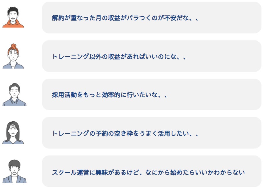 「会員さんの退会が重なった」「自身の店舗の近くに新しいジムが多くなった」「他の事業をしたいけど何をしていいかわからない」など悩みの要素はたくさんあります。