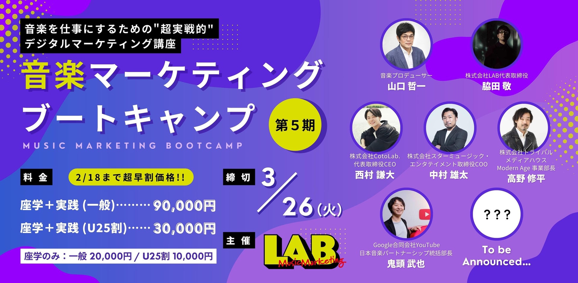 音楽マーケティングスタートアップの株式会社LAB(代表:脇田敬)と株式会社Studio ENTRE(代表:山口哲一)は、トークイベント&書籍発刊プロジェクト「音楽未来会議」と、第5期「音楽マーケティングブートキャンプ」の実施することを発表した。デジタル化により急速に変化した音楽ビジネスの未来を提案し、人材育成と交流を推進する。